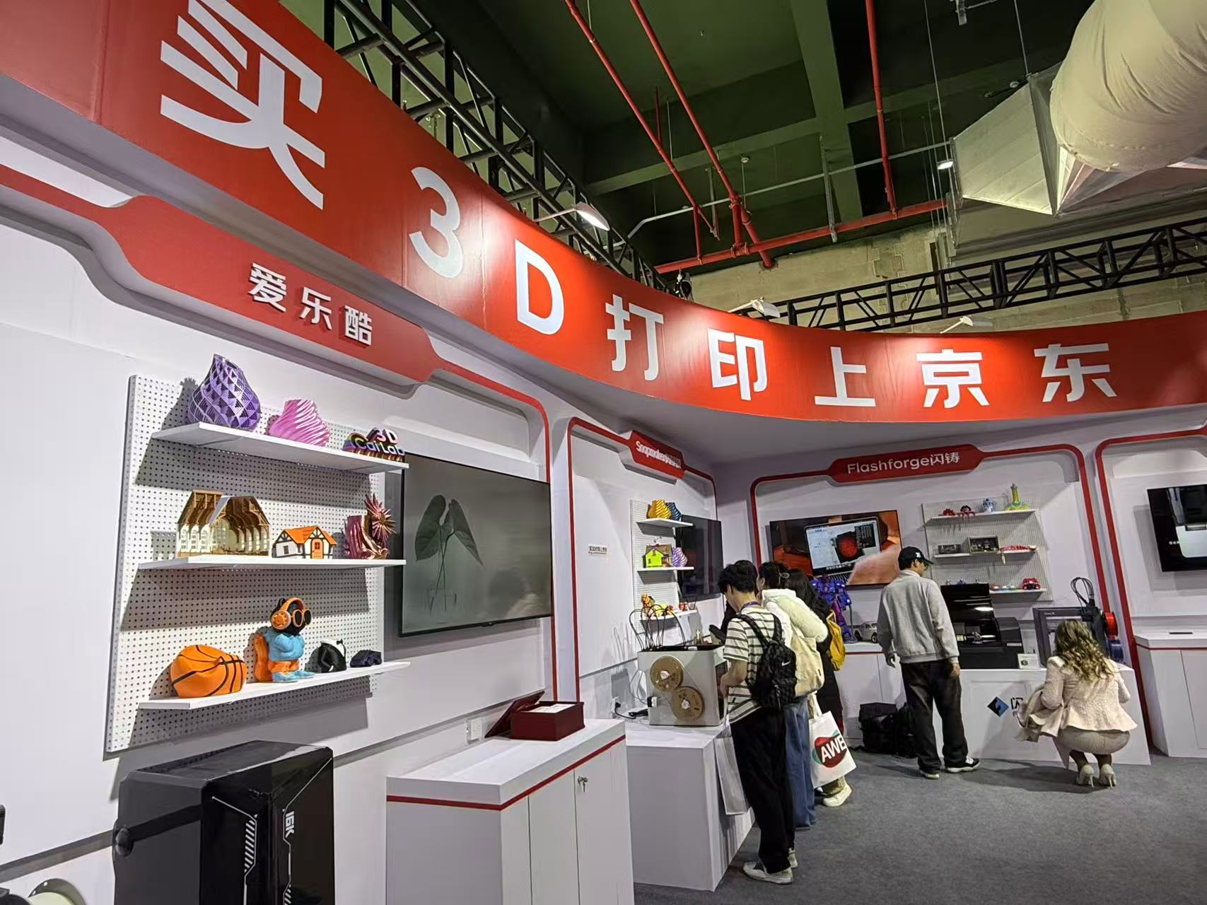 在京东沉浸式科技体验区,3D打印、UV打印核心体验区成了全场“人气C位”,拓竹、安克等品牌的设备持续动态运行,吸引着观众层层围聚。