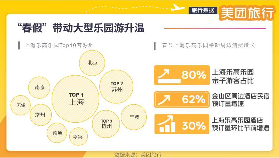 今年春节期间,前往上海乐高乐园的市民游客中,亲子家庭游客占比超八成,带动上海乐高乐园酒店的预订量环比节前增长30%。美团旅行数据显示,除上海本地游客外,苏州、杭州、北京、宁波、南京等“异地游客”将上海乐高乐园作为出游主选。在美团吃住行游购娱“全场景”服务能力的带动下,金山区周边酒店、民宿预订量同比增速达62%,一张门票消费转化为实实在在的微度假体验。