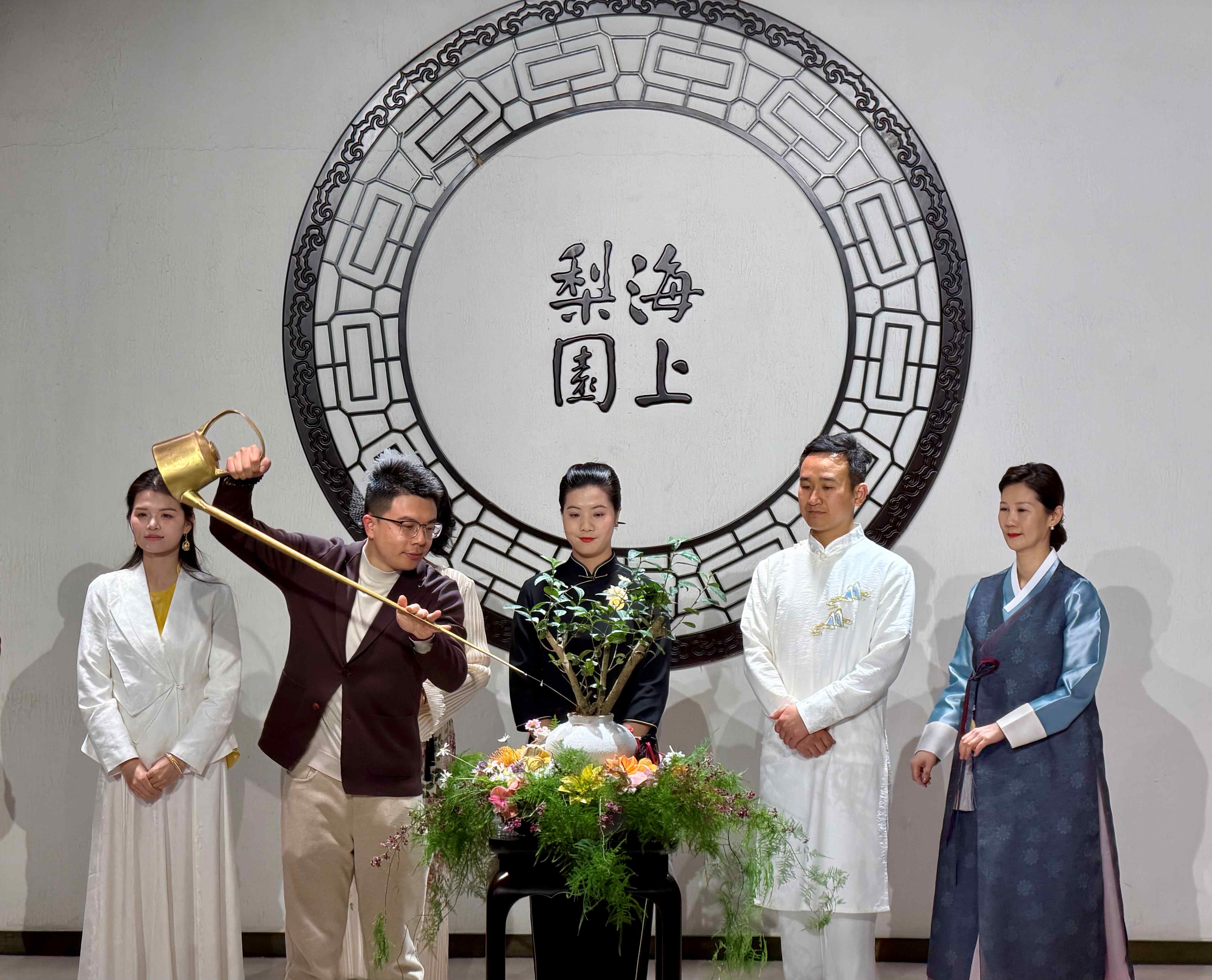 由越剧经典片段《天上掉下个林妹妹》的即兴念白,引出活动重头戏——“五色土·归一味”启幕仪式。五位嘉宾代表手持来自五方的水土,依次登台,缓缓注入中央茶艺装置。随后,大豫园一期(豫园商城)联席CMO、海上梨园主理人王鹏上前注入清水,水土交融,茶意已生,象征着天地人和、四海归心,也宣告着海上梨园“湖心亭海上茶席”正式开启。