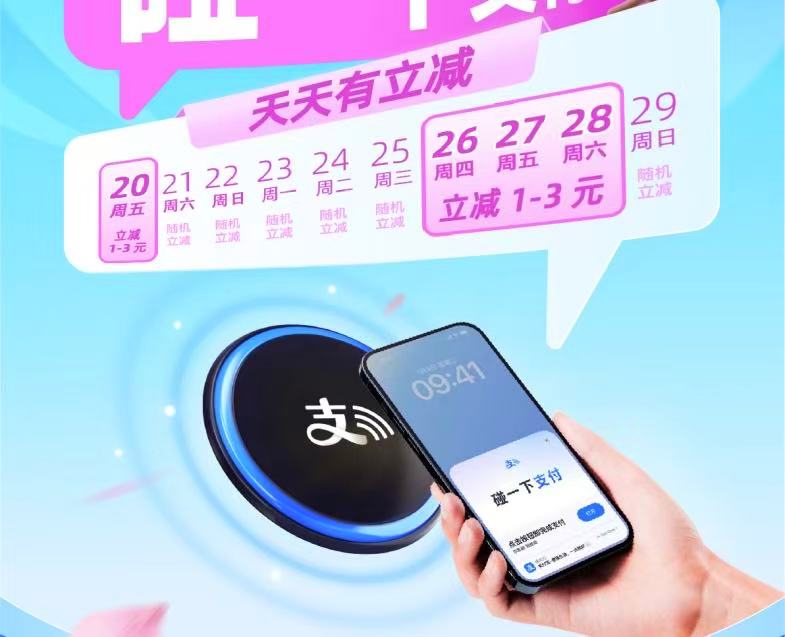 活动期间,消费者在全市所有接入“碰一下”支付服务的商家门店,每人每天可享一次立减优惠。其中,26-28日(周四、五、六),“碰一下”可随机立减1-3元。