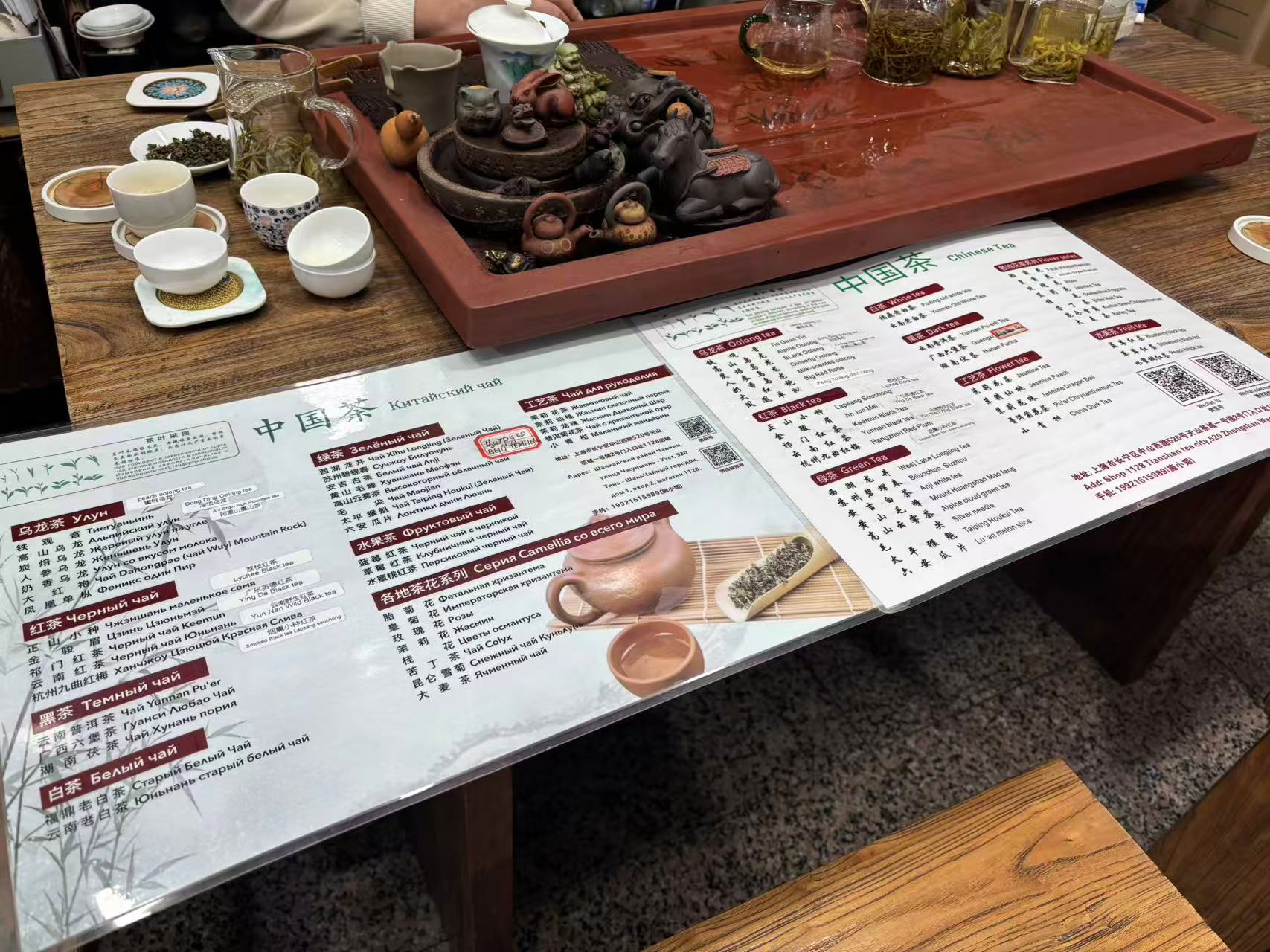 劳动报记者注意到,尽管“清明时节雨纷纷”,茶城里却不断有海外游客前来采买茶叶,商家也是耐心介绍不同品种的春茶。“现在海外游客很多,大部分说英语和俄罗斯语,所以我准备两张‘双语茶单’,一张为中俄双语、一张为中英双语,把各种中国茶的类别清晰标注,游客来了一开口,我就能快速应对。”茶商施女士介绍。