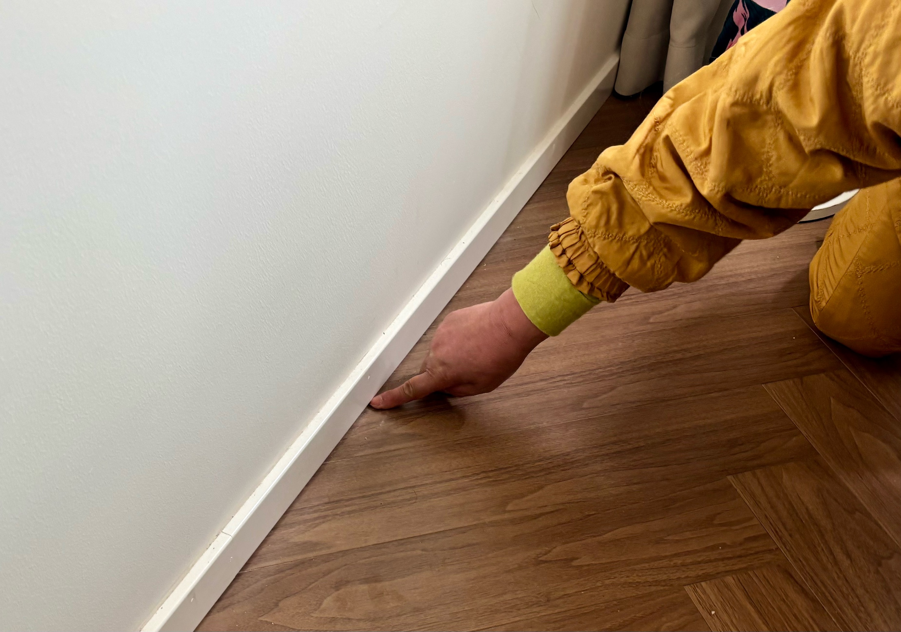 在不大的房子里走一圈,何女士更生气了。“有没有听到地板咯吱咯吱的响声?”何女士告诉劳动报记者,地面所使用的实木复合地板并未铺平,因此在家中步行总有声响,特别是晚上更为明显。随即,她又来到房间处,贴着边上的踢脚线部位,用脚踩了踩地面,竟从下方缝隙处冒出了白色灰尘。
