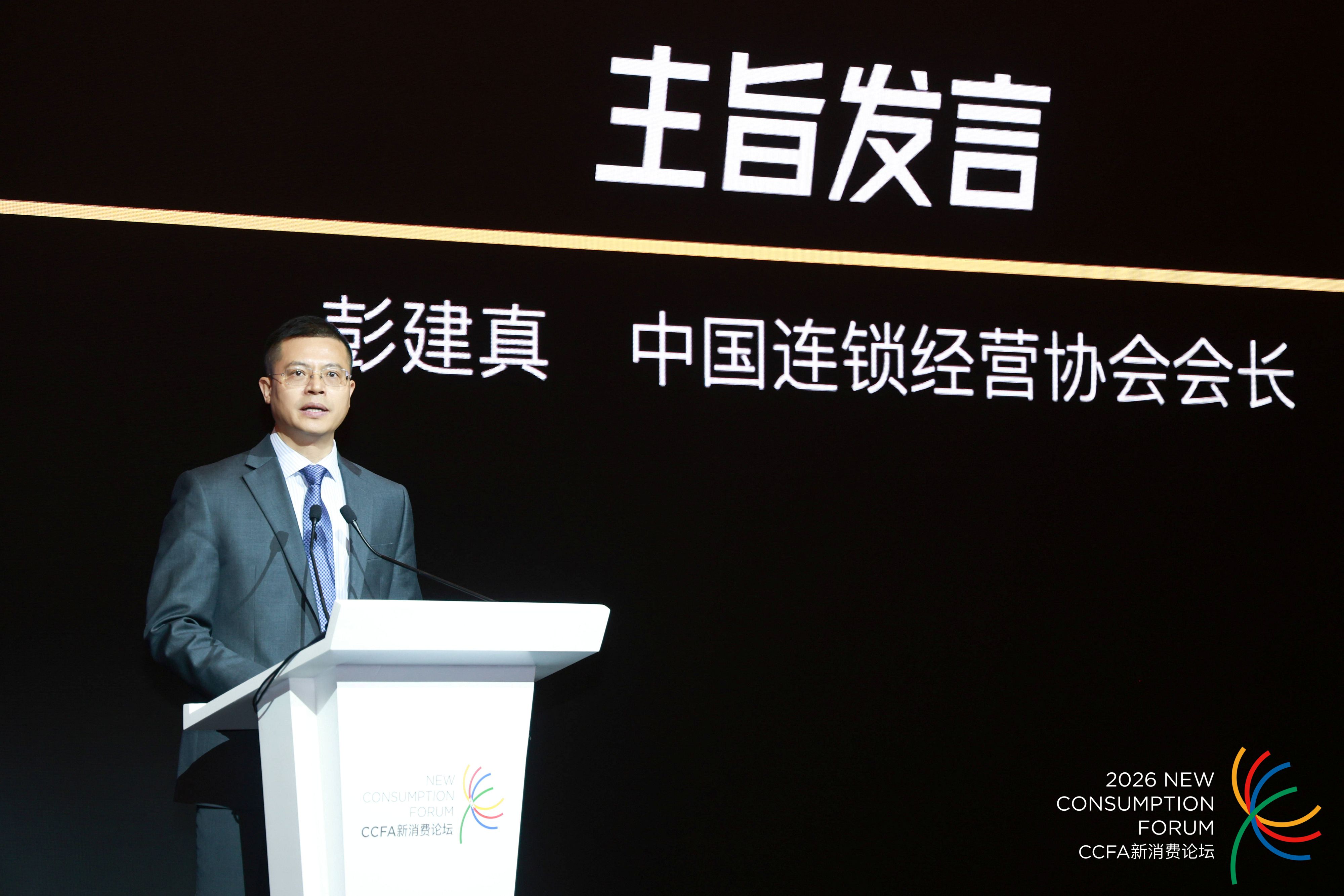 头图:2026中国连锁餐饮峰会于上海举行,图为中国连锁经营协会会长彭建真致辞。受访对象供图