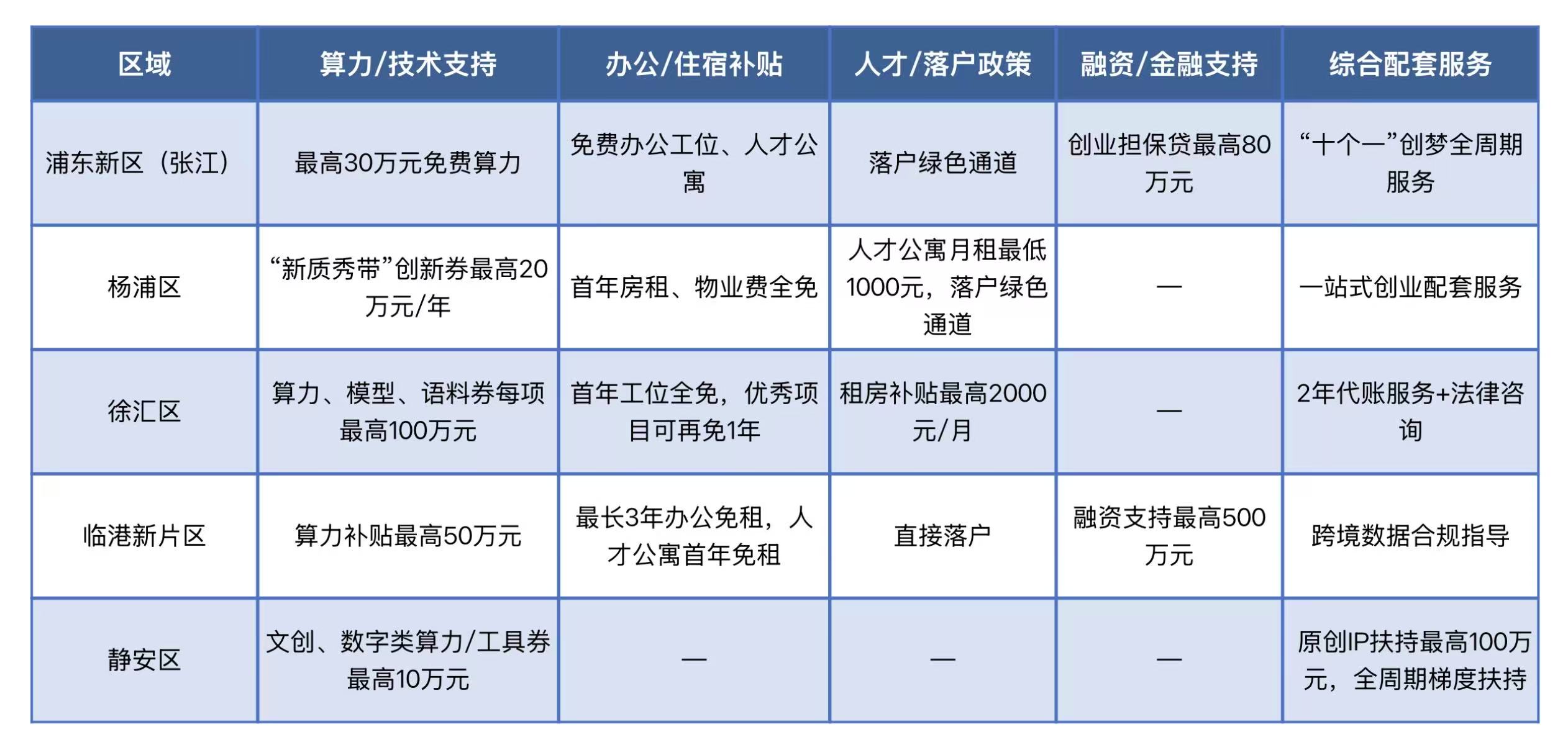 上海各区结合自身产业特色,针对OPC推出了专项扶持政策,覆盖场地、算力、资金、人才等多个维度,创业者可根据自身创业赛道和注册地选择适配政策。