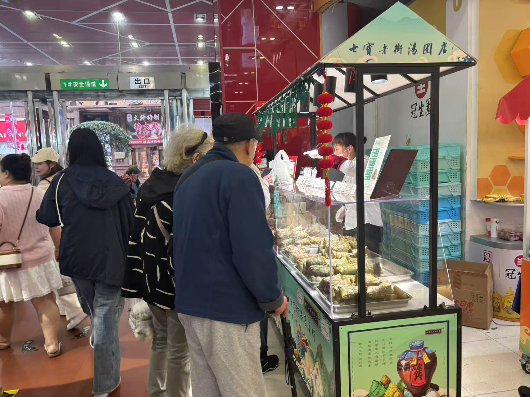 “青团还有少量在售,比如陈皮豆沙、春三鲜、咸蛋黄肉松等经典口味,很受市民喜欢。传统的枧水粽、豆沙粽,还有乌米细沙粽、红豆蜜枣粽、紫米八宝粽、鲜肉粽、鲜肉蛋黄粽、黑毛猪肉粽、双黄黑毛猪肉粽等粽子都已开售。”新雅门前已由青团销售专柜改为了端午粽销售专柜,工作人员透露,传统口味更受市民追捧,当日的乌米细沙粽已早早售罄。