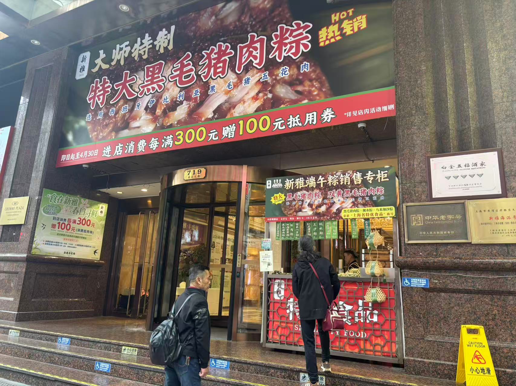 一年一度的“端午季”,老字号新雅粤菜馆的“粽娘现包大肉粽”的场面总是格外吸引人。当下,“粽娘”尚未现身,老字号新雅“大师特制”的特大黑毛猪肉粽招牌已高高挂起,一个粽子包裹足足4块大肉,高峰期还会采取“限购”临时措施。