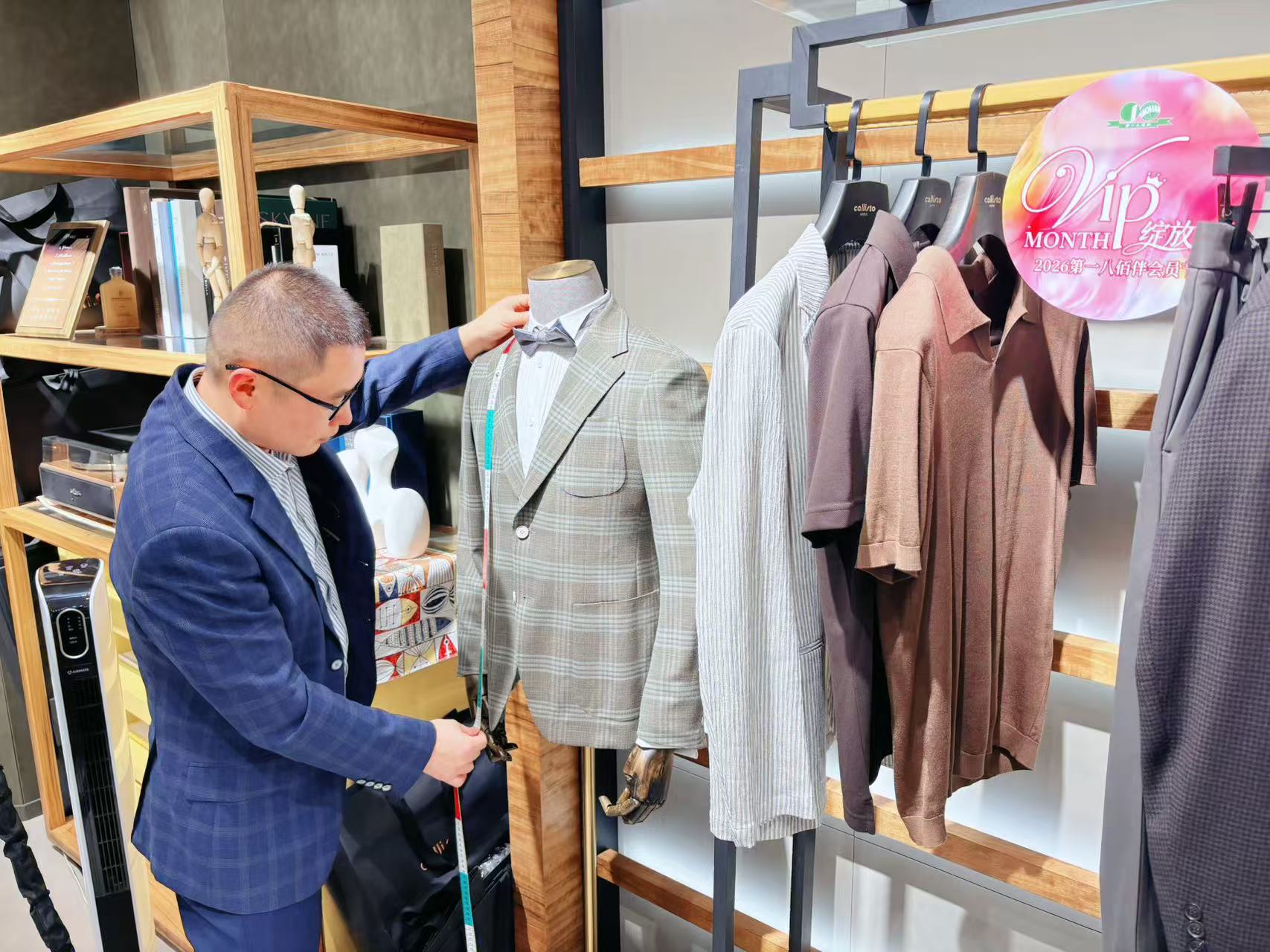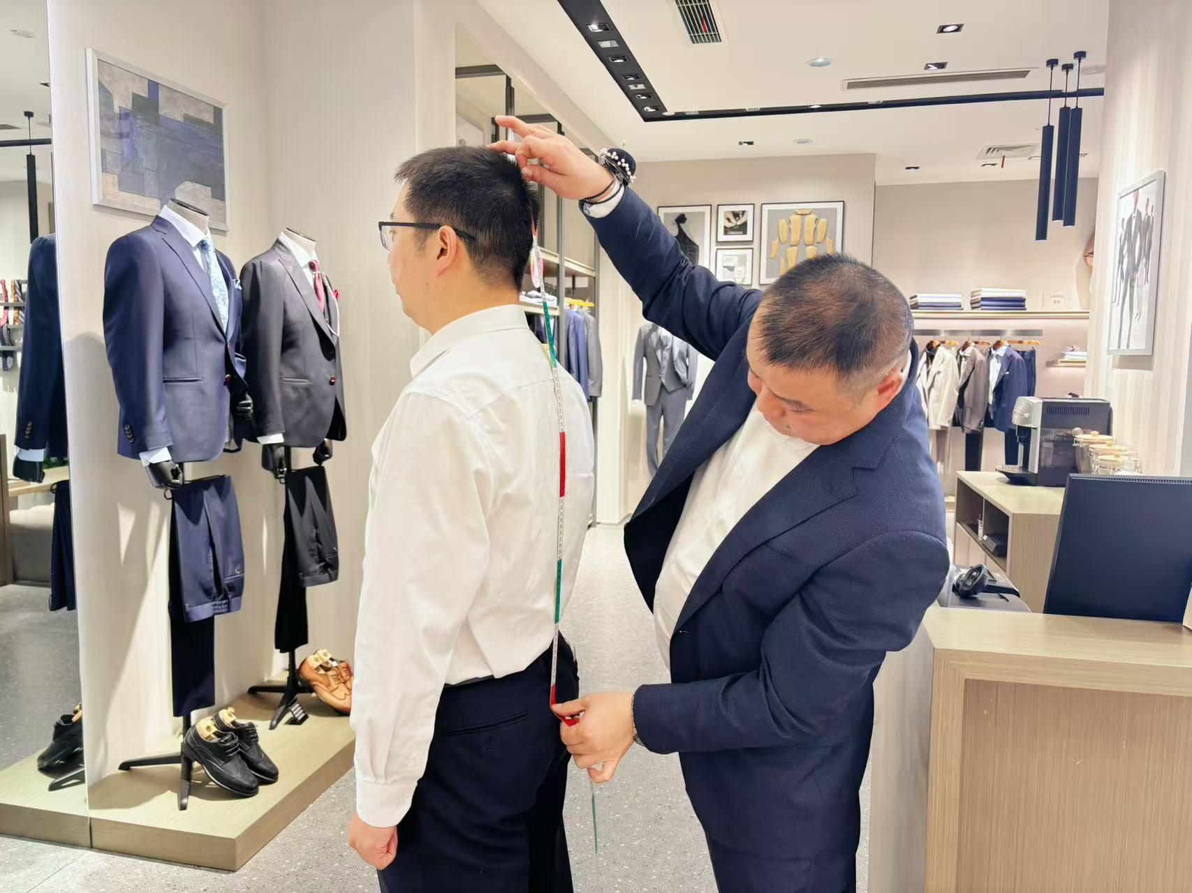 意大利品牌卡利斯特专柜内,定制师于建军正在为顾客量体裁衣。他手指专柜摆放着的一套礼服款西装告诉劳动报记者,礼服可由内到外、从头到脚实现“定制”,比如礼服内的一件衬衣,其前片打褶造型就是“定制”设计款,天气逐渐炎热,顾客也可以选择轻透的面料,更舒适也更贴合身材需求。