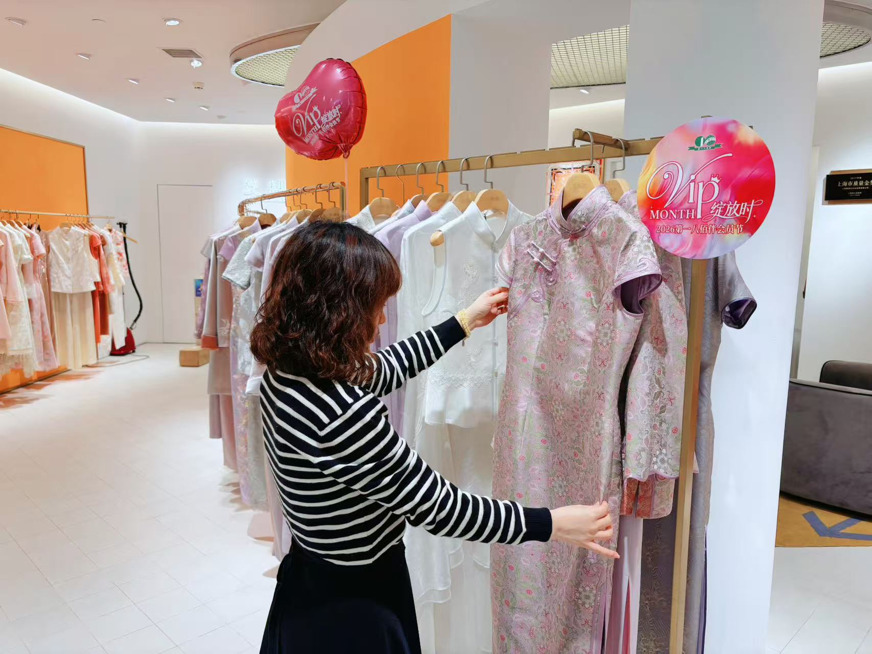 “旗袍也可以适用于日常穿着,比如一件常规版型的旗袍,两边下摆经过设计改版,形成小小的‘百褶’作为点缀,更为‘时髦’和‘惊艳’,适配多种场合的穿搭。”蔓楼兰第一八佰伴店店长郑蓉告诉劳动报记者,根据顾客需求,门店常常会为顾客进行“一对一”的专属定制服务,比如,根据穿搭需求,把法式珠绣、施华洛世奇的水晶、盘扣苏绣的元素运用到旗袍和女装的设计中,而顾客可以从优选面料开始全程参与,门店也会给予顾客专属的“定制仪式感”。