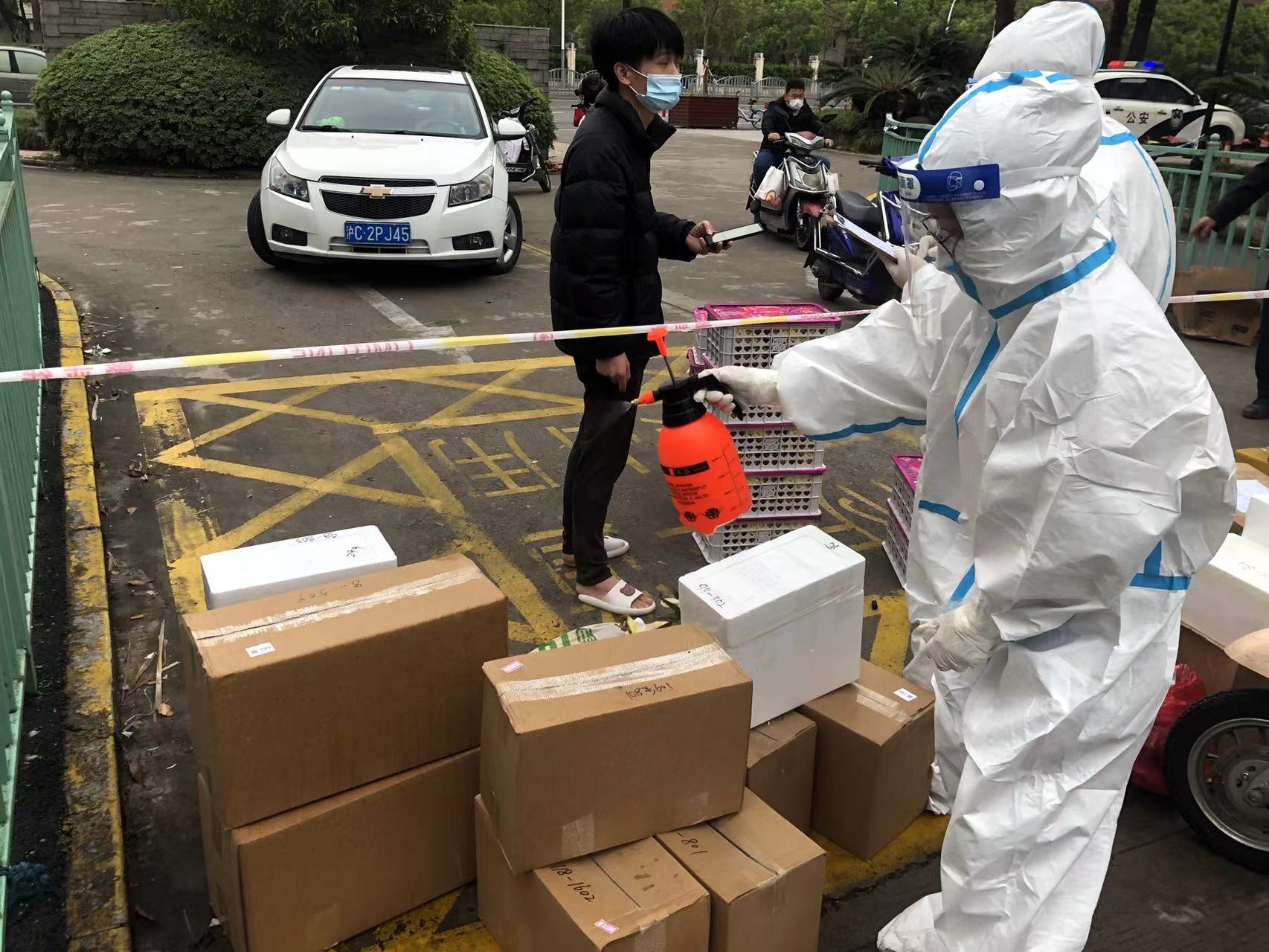 4月17日清晨7点,上海松江区方松街道维罗纳小区南大门口,居民团购的一批牛奶、鸡蛋等生活物资刚刚到货,“团长”马军红就忙着按照门牌号将物资分类堆放在一起,待消杀后分发。