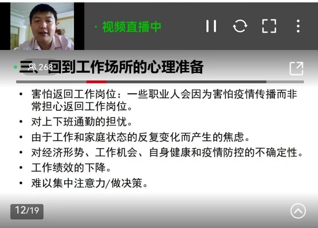 通过讲座,大家对自己疫情期间身心状态的改变有了更多的了解和思考,也学习到了如何更好照顾自己、应对工作的挑战、平衡家庭关系的方法,伴随老师的讲解,大家一起调适内心、接纳疫情“新常态”,做好复工复产的心理准备。