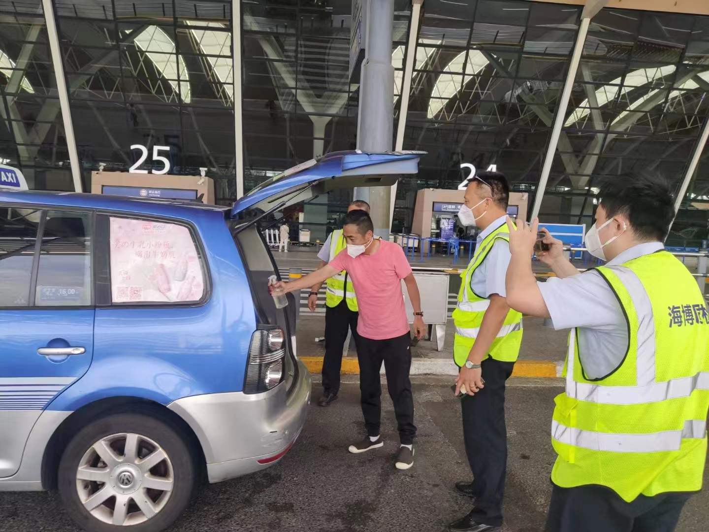 7月11日开始,本市对浦东机场停车场的出租车私接扰乱秩序行为进行专项整治,海博道检队配合警察、交通执法和机场相关部门,和本市各大出租公司道检人员一起,冒着40摄氏度的高温,每天从上午九点工作到晚上九点,在浦东机场一干就是12小时。