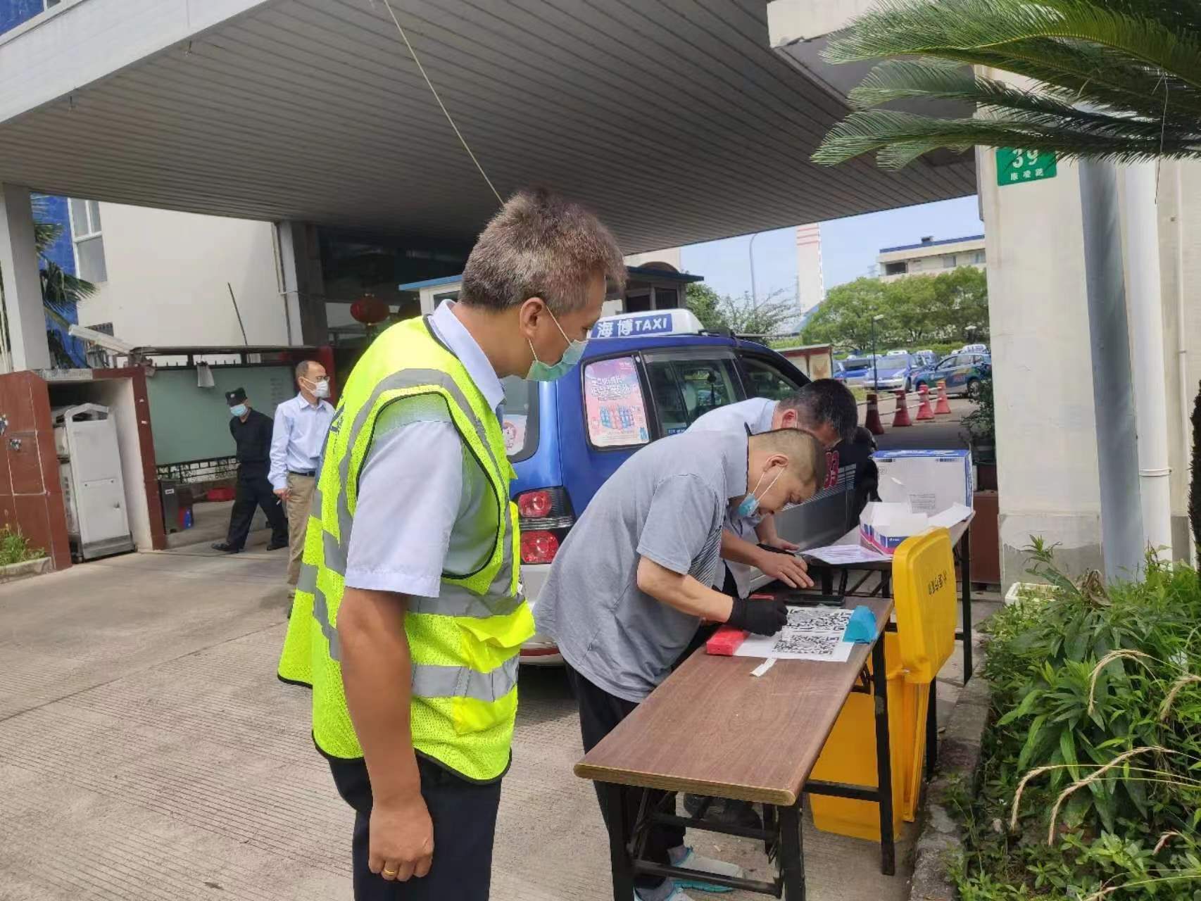 海博道检队对本公司出租车的车载消毒壶、消毒标帖、口罩佩戴、员工码、场所码,以及“一差一消毒”等防疫措施进行检查,及时提醒驾驶员做好个人疫情防控,道检队还参与公司防疫和高温降暑物品的发放,对站点人员的核酸和抗原检测进行抽查。