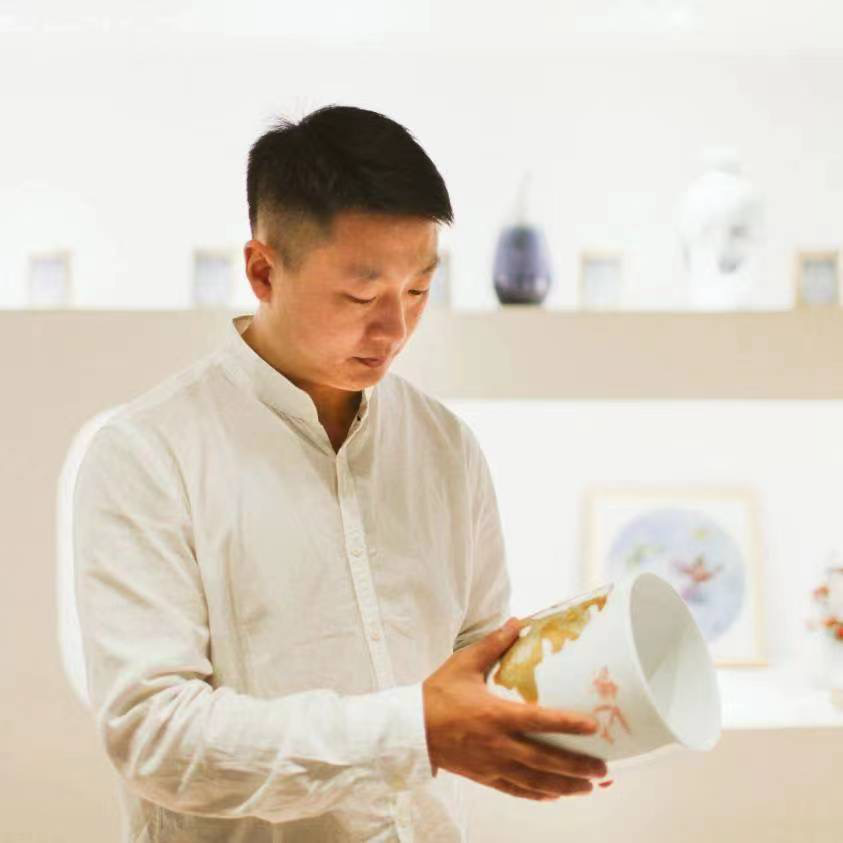 周景纬出身制陶世家,幼年随祖父、景德镇瓷业名家周日辉先生承习陶瓷成型技艺,并且在杜浩生先生的熏陶下学习陶瓷绘画,少年时跟随父亲、景德镇传统原材料配制非物质文化遗产代表性传承人周晓华先生学习传统泥釉料配制。从七岁开始第一次触摸泥、把第一件用手做出来的东西烧成瓷器,到今天在继承家学的基础上不断创新、研究出陶瓷装饰绘画特色工艺“釉下错金银彩”、拥有多项国家实用型专利和国家发明型专利、获评“上海工匠”,陶瓷已然是周景纬生命的华彩部分。反之,周景纬的生命亦因陶瓷而完整、饱满,充满动感和美感。