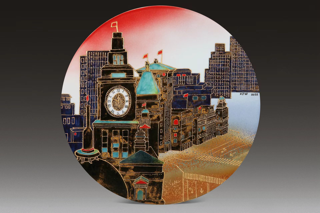 再譬如,他的陶瓷作品获奖无数,不少作品被收藏,深受人们的喜爱。其中《百年钟声》是他个人比较满意的一件新作品,作品采用陶瓷釉下错金银彩裂金工艺、以黄金独有的肌理感结合珐琅工艺绘制而成,献礼建党百年。