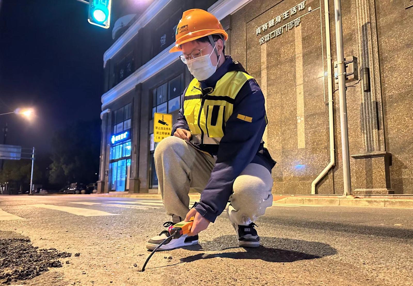 上海燃气旗下大众燃气公司管道工程公司员工夜间抢修查漏。