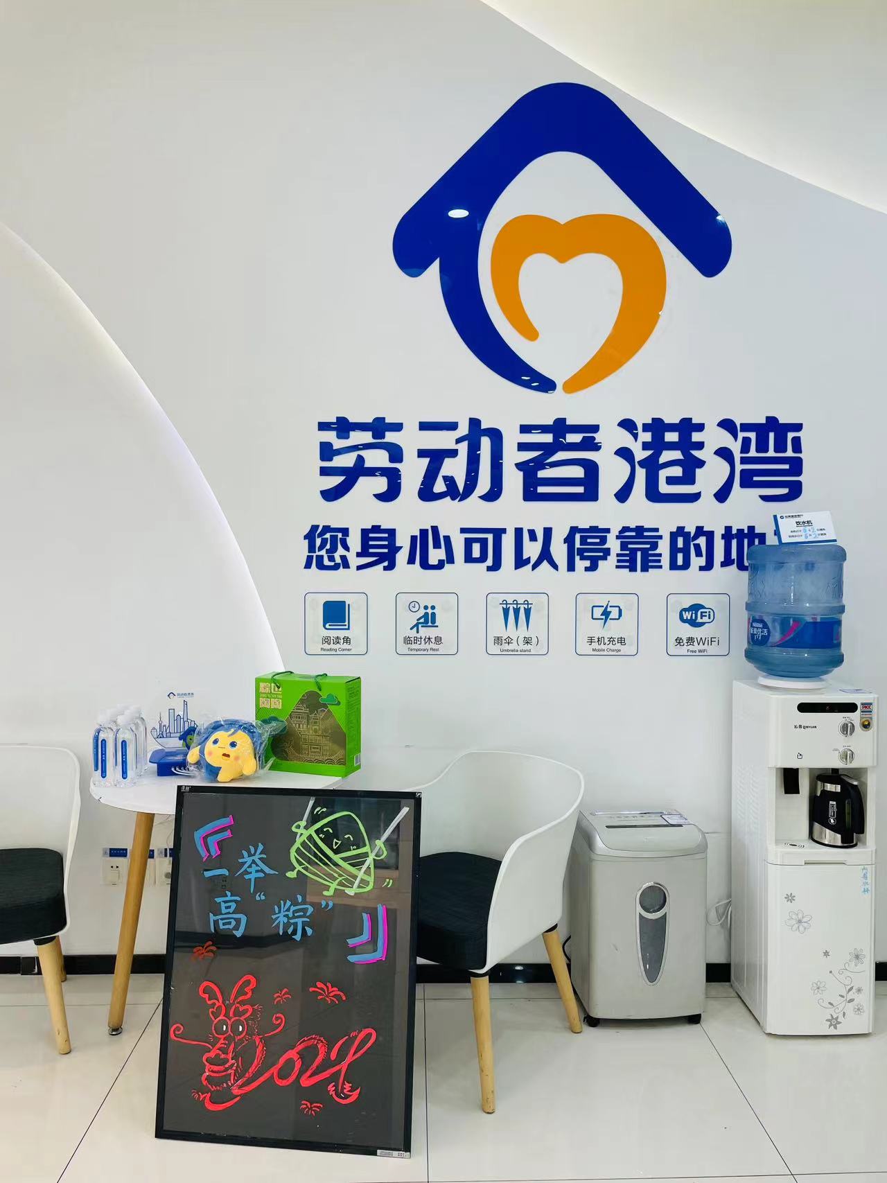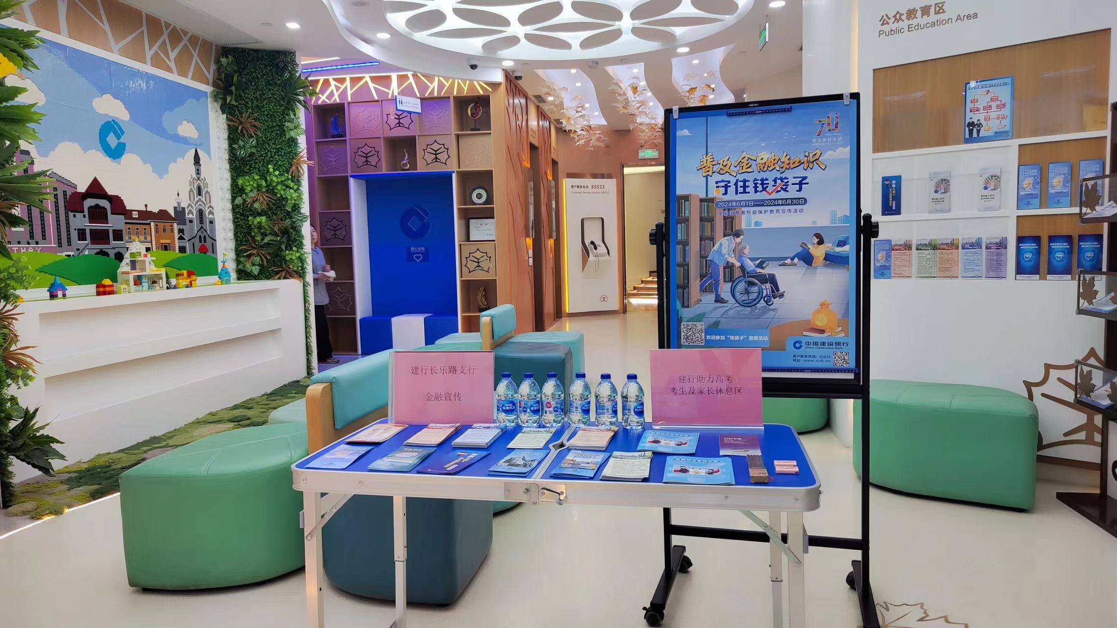 建行上海长宁威宁路支行与高考考点之一的上海市延安中学仅一条马路之隔。高考前夕,一块“逢考必过”的易拉宝在该网点“劳动者港湾”里竖了起来,可爱的卡通形象“湾宝”目光温暖而坚定;最新款“劳动者港湾”充电器、文具“福袋”、“湾宝”风扇等应急物资整齐地摆放在休息区域。