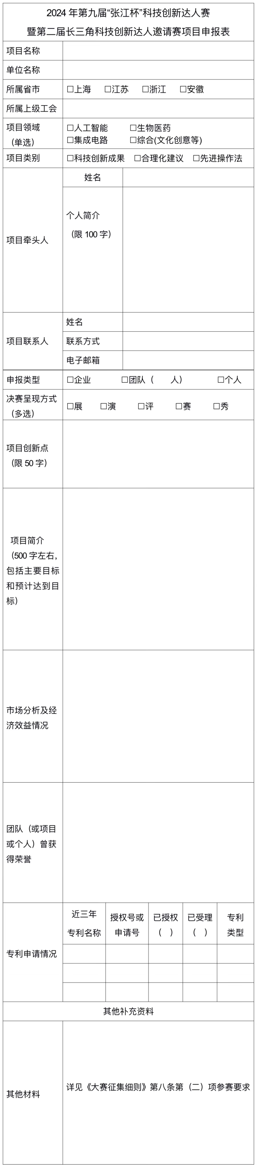 2024年是新中国成立75周年,是实现“十四五”规划目标任务的关键一年,是全面贯彻落实中国工会十八大精神的开局之年。为更好地贯彻落实党的二十大精神,进一步推进长三角地区高技能人才与技术聚集及创新成果转化,特举办2024年第九届“张江杯”科技创新达人赛暨第二届长三角科技创新达人邀请赛,现正式启动项目征集。