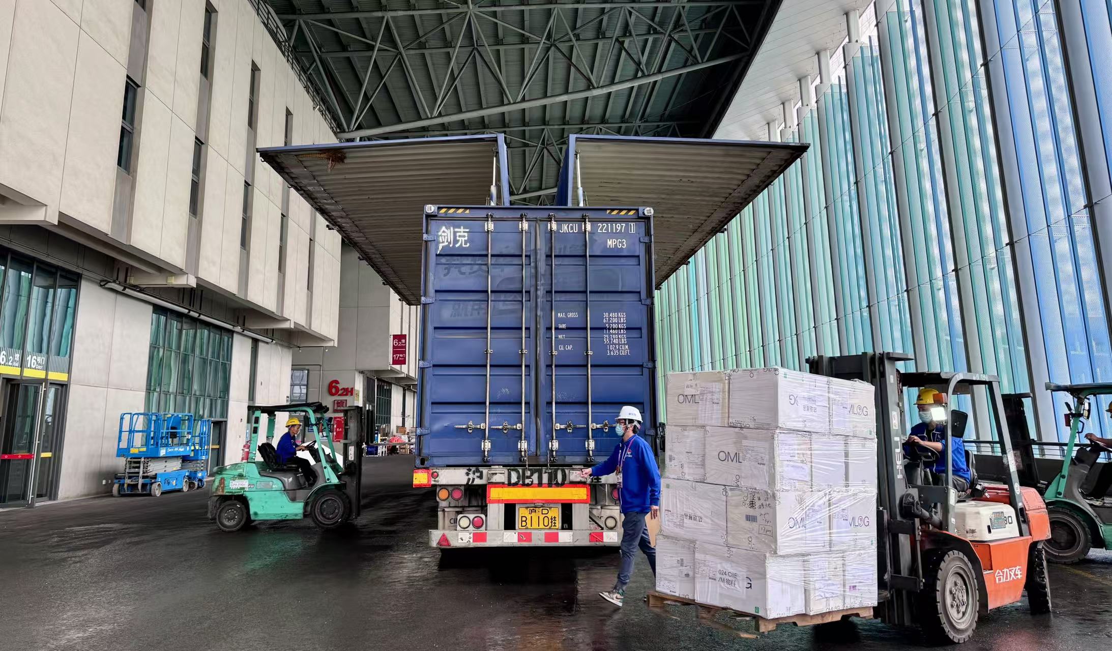从9月开始,团队便开启了24小时全球跨时差的“进博时间”。至10月下旬,“蓝精灵”团队携机械设备全员进驻场馆,连续20余个日夜奔走在“四叶草”里。驻场首周,团队日均装卸货近1000立方米。在展品进场高峰期时,所有叉车悉数出动。为支持现场搭建工作,团队调配了数台吊机,确保 “一馆两人”“一车两人”,力争“零投诉、零缺陷、零差错”,高效保障展品100%安全按时抵馆、展商100%满意。