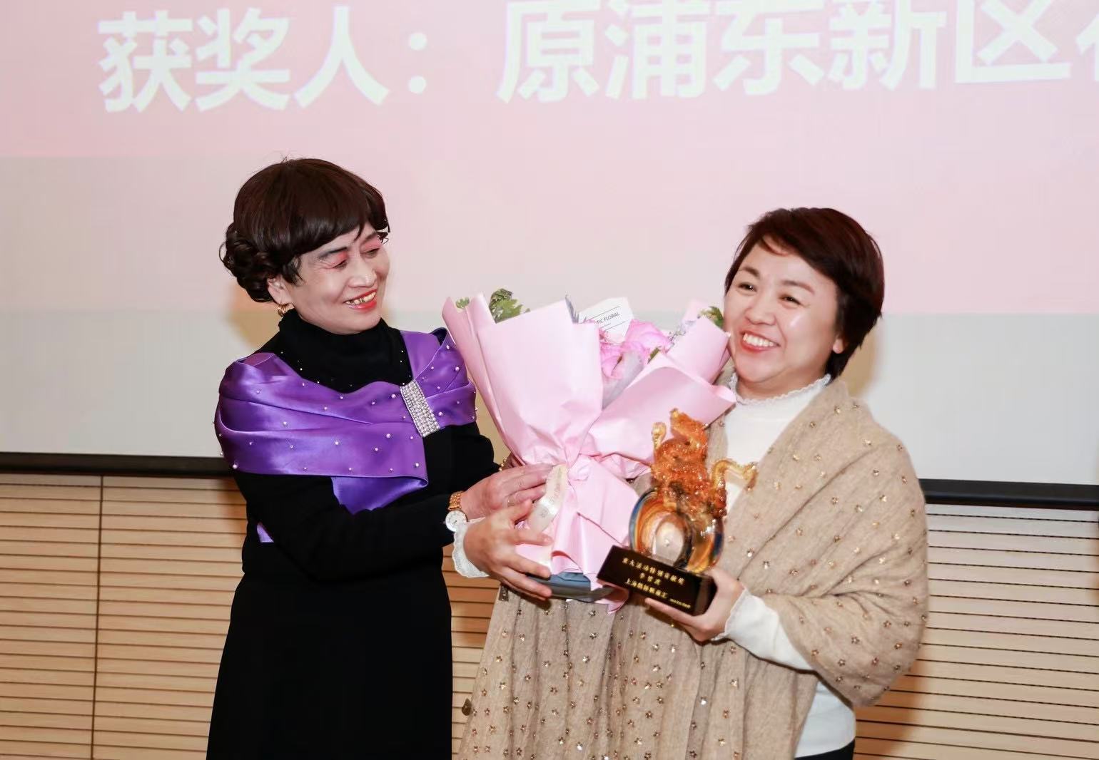 红梅老师(左)向李碧波(右)颁发“重大活动特别贡献奖”。