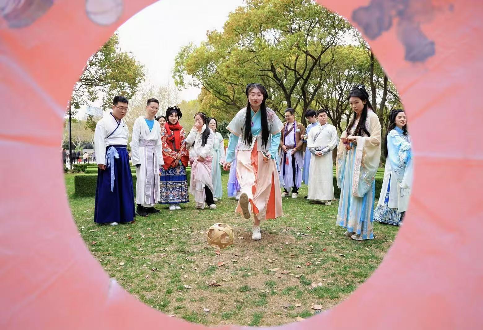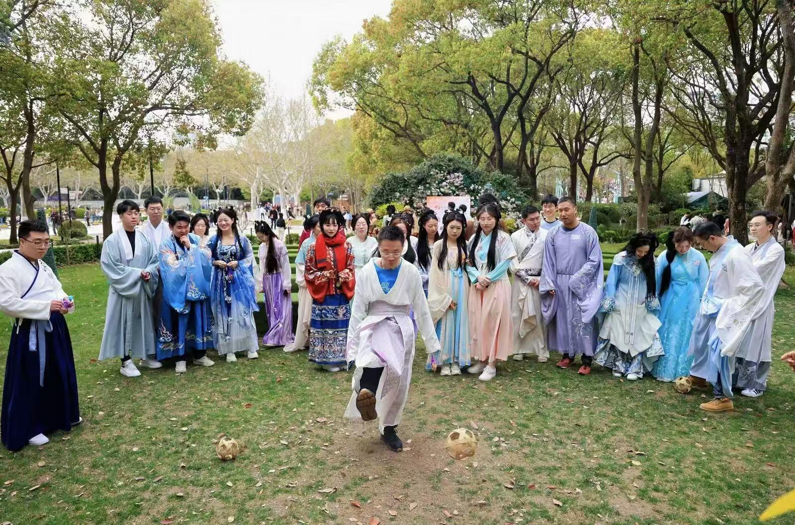 活动巧妙融入蹴鞠、捶丸、投壶、毽球等传统游戏,青年们分组竞技,活力四射。“花间投壶”区,嘉宾屏息凝神,花枝入壶瞬间掌声雷动;“捶丸”挑战中,小球精准入洞引发欢呼;蹴鞠赛场上,团队协作踢球入孔洞,精彩表现更是将气氛推向高潮。身手矫健者在一分钟内踢毽超20次,高举V字手势庆祝胜利。