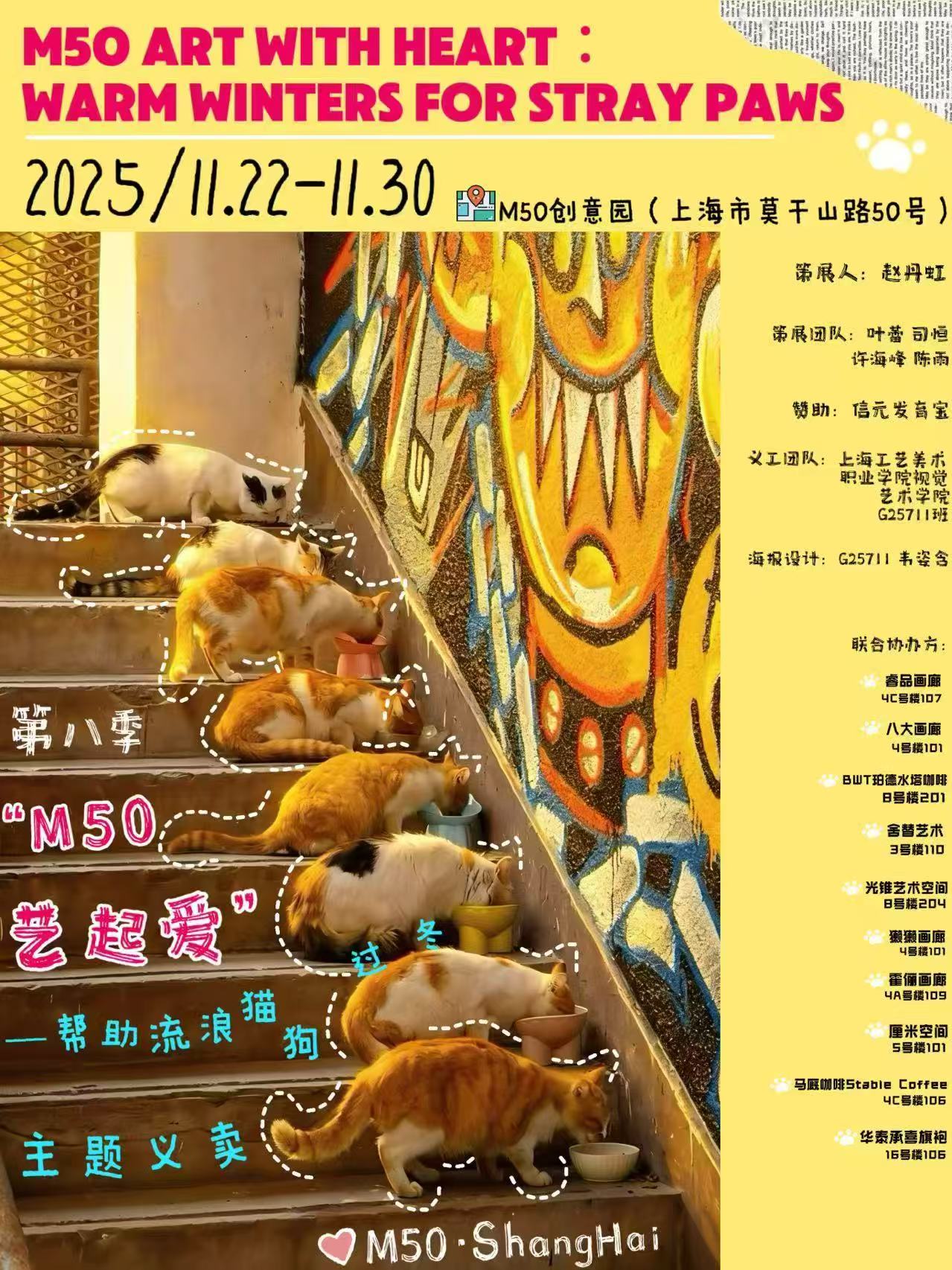 尤其,今年M50创意园大力支持活动举办,吸引园区多家画廊和机构参与其中,让活动规模和影响力进一步扩大。园区内“舍替画廊”负责人林恩华为本次水彩画展捐赠了30个精致的金色画框;运营“BWT珀德水塔咖啡”的王伟,在园区网红打卡点设计了一只向往有家的小狗形象的Puddy,并创制了各种艺术衍生品参加活动,提出“有Puddy的地方,就是家”。另外,还有“八大画廊”在义卖现场带来塔罗游戏,“华泰承喜旗袍”捐赠了茶杯;“马厩咖啡”则在活动期间承诺“每售出一杯咖啡捐款5元”,同时为M50园区设计了宠物友好的徽章和标志。据了解,该义卖活动的全部善款将捐赠给小动物保护机构和民间流浪猫狗救助组织。