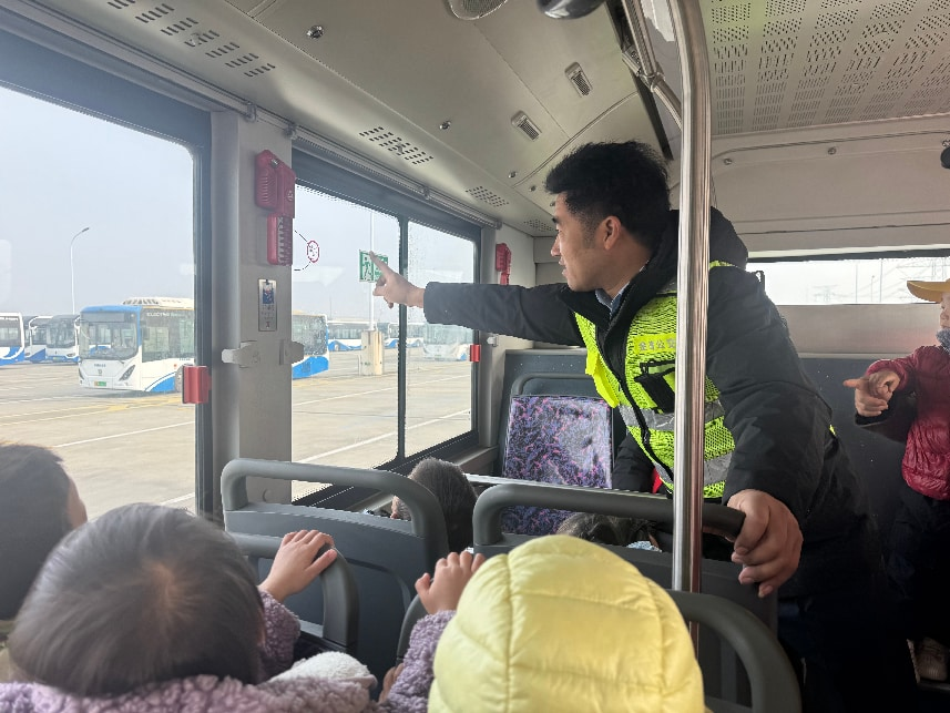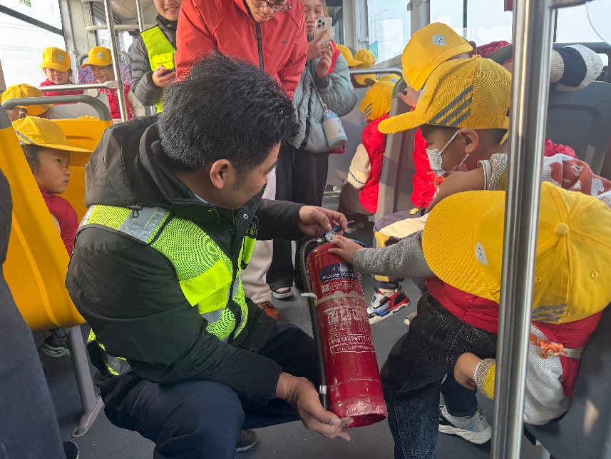 宣传活动过程中,公交志愿者们带着孩子们在确保安全的前提下于曹路停保场的五楼,安排幼儿们依次上车体验。只见幼儿园小朋友们都兴奋的坐到了公交车内,感受公共汽车的内部空间,观察车内的设施,如座椅、扶手、投币箱、刷卡机等。教师和家长志愿者在旁协助,引导幼儿观察并讲解这些设施的用途。公交志愿者们给小朋友们现场演示了安全锤的使用、乘客应急门如何打开、针对有轮椅出行的乘客,车厢中门翻板如何使用、指出了应急出口和灭火器的位置及在乘坐公交车过程中需要注意的多项安全事项、公交车的盲区范围等,以增加幼儿园小朋友们的安全知识。