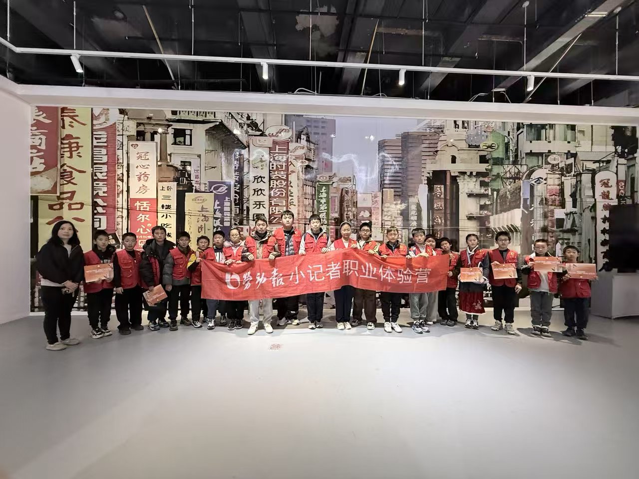 走进一楼展厅,这里展览定期更新,“小记者”们参观时正逢“海上生花”字体插画设计艺术展展出。建筑内旋转楼梯的设计,本身独具美学特色。随着一级级楼梯上楼,一幅幅字体设计师的肖像悬挂于阶梯旁墙上,展示着为汉字印刷字体做出杰出贡献的一代代非遗传人的风采。