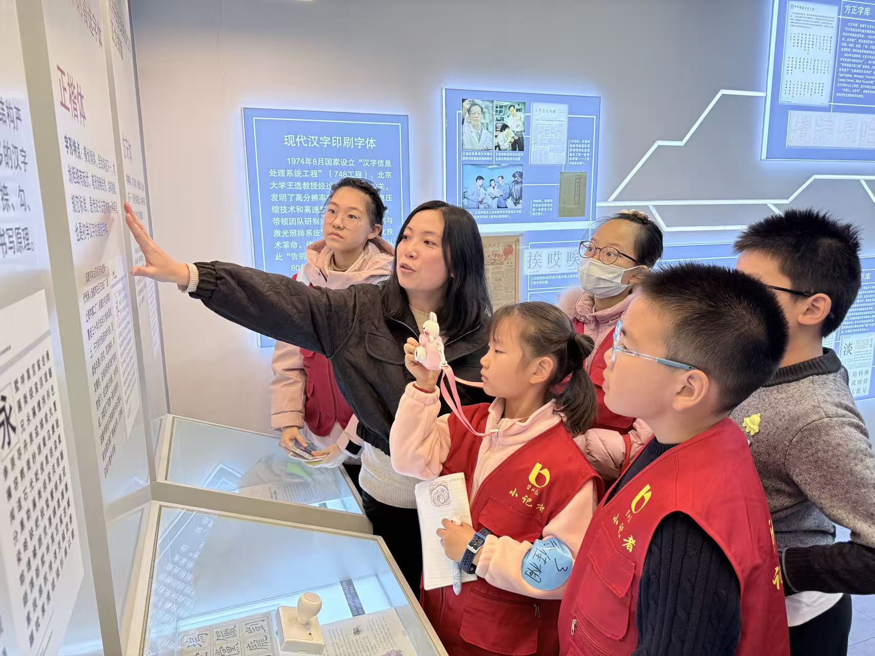 键盘敲击、手机按键,一串串文字整齐显示出来;读书看报、工作学习,印刷字体无处不在。日常生活中,最常见的就是“宋黑楷仿”4种字体。可字体是如何诞生的?背后有着怎样的故事……在此次活动中,上海工匠、“汉字印刷字体书写技艺”第四代非遗传承人万世琴结合展厅四大板块的内容,向“小记者”们耐心讲解了汉字来源、印刷字体的发展演变等。