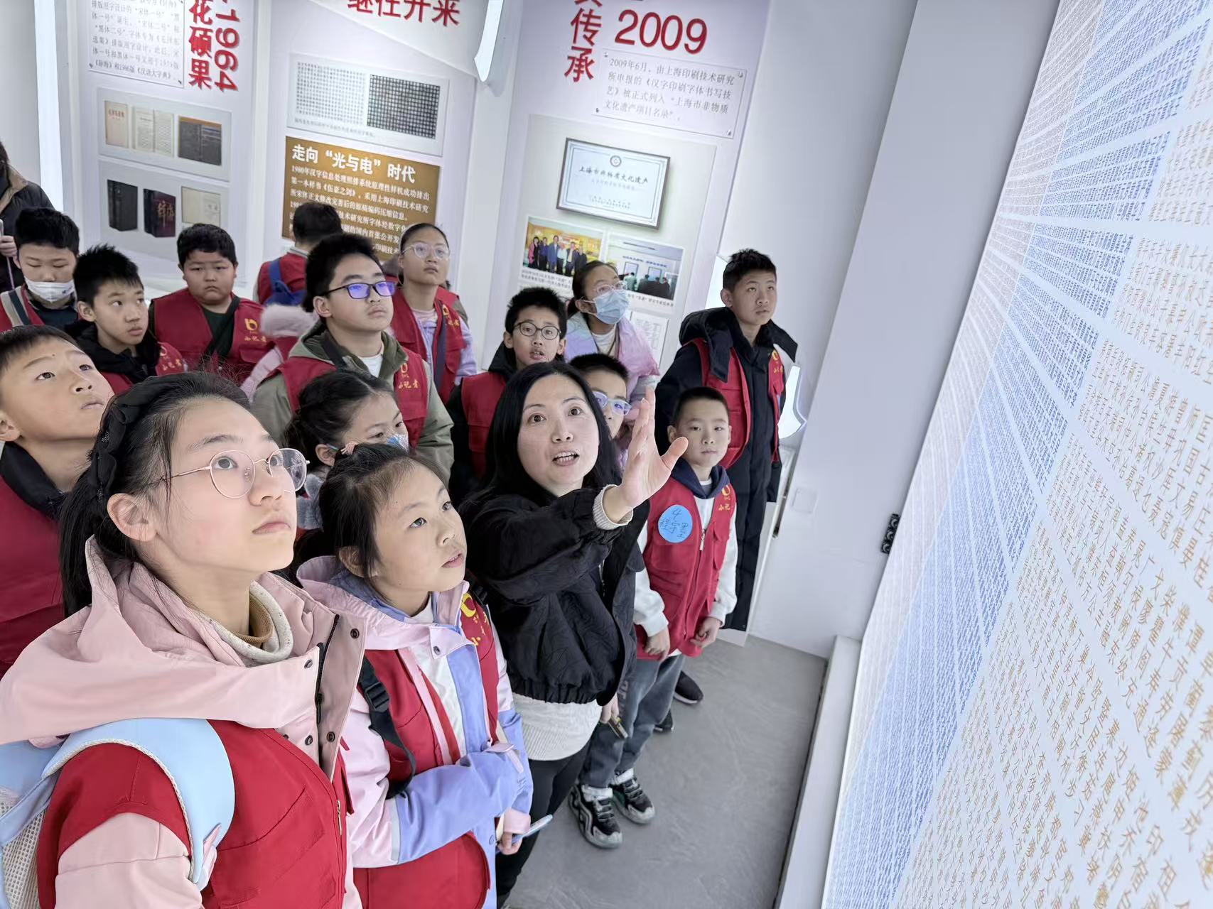 在“字里匠心”展厅,丰富的史料和实物展现了60多年前凝聚着非遗传承人毕生心血的“现代汉字印刷字体”的诞生过程。万世琴向“小记者”们讲解了这项技艺的关键所在。“每一个汉字都要经过5个步骤,分为铅笔稿、划线、勾线、填墨、描白这五道工艺流程才能完成。”“你们猜一人一天能描几个字?”当听老师讲道,一个字需要经验丰富的研究人员描画三个多小时,每个人一天只能完成三四个字,“小记者”们大为惊叹,工匠精神跃然纸上。20世纪60年代初,上海率先进行“印刷字体改革”,一批沪上美术创意有功力、书写正楷有造诣、雕刻字模有经验的人才汇聚,组建了50多人的字体研究室。第一代专业字体设计师们耗时5年多,相继完成了宋、黑、楷、仿四种常用印刷字体,总计8万字的创写设计,为新中国推广简化字和汉字规范化作出重要贡献。这四款常用字体作为印刷字体的母体一直沿用至今。2009年,“汉字印刷字体书写技艺”项目被列入上海市第二批非物质文化遗产项目名录。