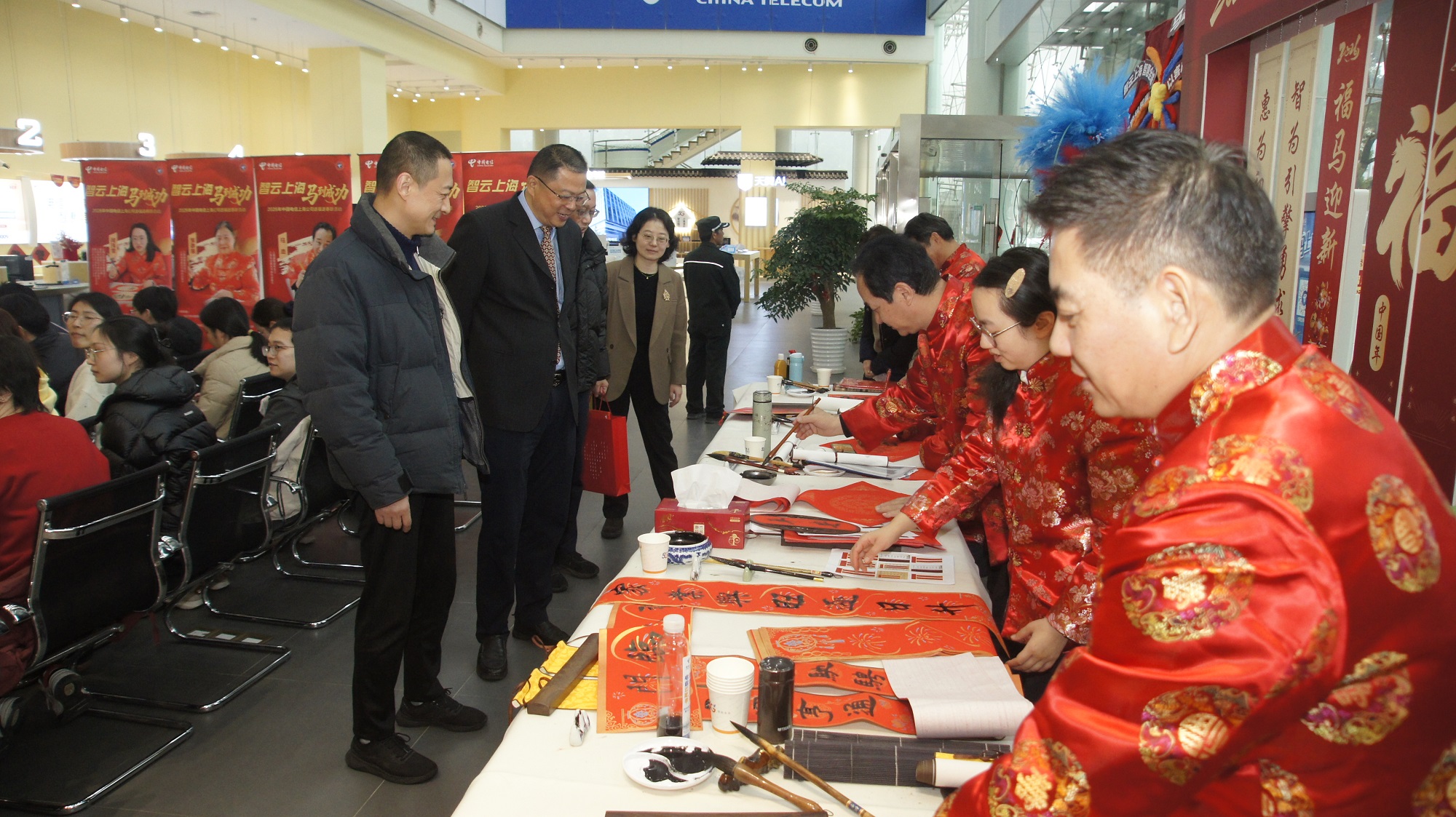食堂的温馨尚未散去,位于卫零路的电信营业厅已化身为新春文化盛宴的舞台。此处墨香四溢,特邀的书法老师铺纸研墨,挥毫泼墨。笔走龙蛇间,一副副承载着吉祥寓意的春联、一个个饱满遒劲的“福”字、一幅幅寄予美好祝愿的书法作品跃然纸上,吸引了众多职工及办理业务的市民驻足欣赏、排队领取。现场书写的春联,比之印刷品更多了一份人情温度与艺术灵气,成为备受追捧的“抢手年货”。