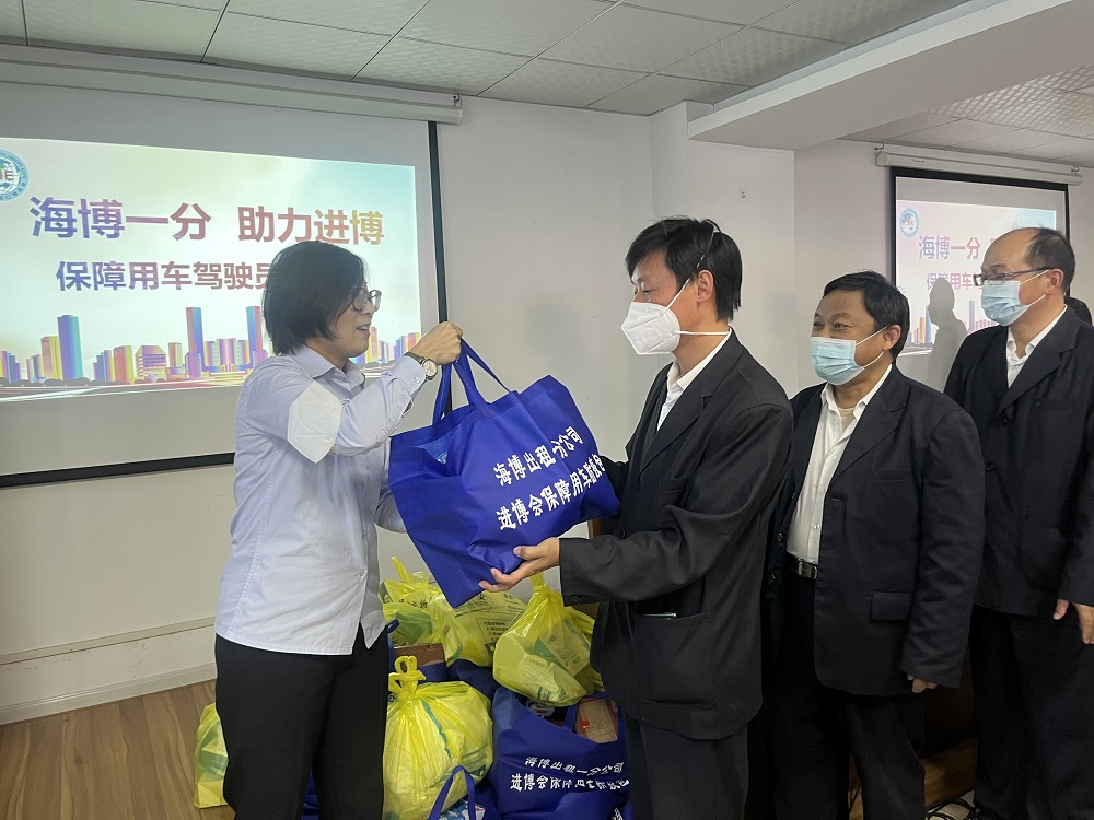 一批防疫包分医药用品包(包括消毒酒精、一次性洗手液、体温计、抗原试剂、体温记录卡、笔、一次性口罩、礼仪手套、防护服等防疫物资包)和食品包(面包、牛奶、矿泉水),已发放到参与进博会保供的驾驶员手中,确保驾驶员防疫到位,精准服务进博,做好后勤保障。