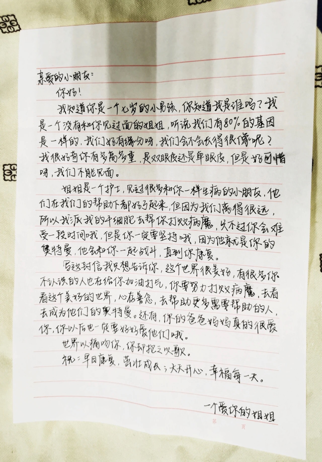 “姐姐是一个护士,见过很多和你一样生病的小朋友,他们在我们的帮助下都好了起来,但是因为我们离得很远,所以我派我的干细胞去帮你打败病魔……写这封信我只想告诉你,这个世界很美好,有很多你不认识的人也在给你加油打气,你要努力打败病魔,去看看这个美好的世界。”