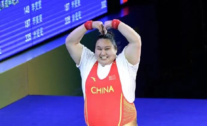 挺举比赛中,李雯雯开把最初报的175公斤,但看到其他选手在160公斤展开缠斗后,李雯雯将开把重量降为167公斤。顺利举起后,她向观众送上了标志性的头顶“比心”动作。