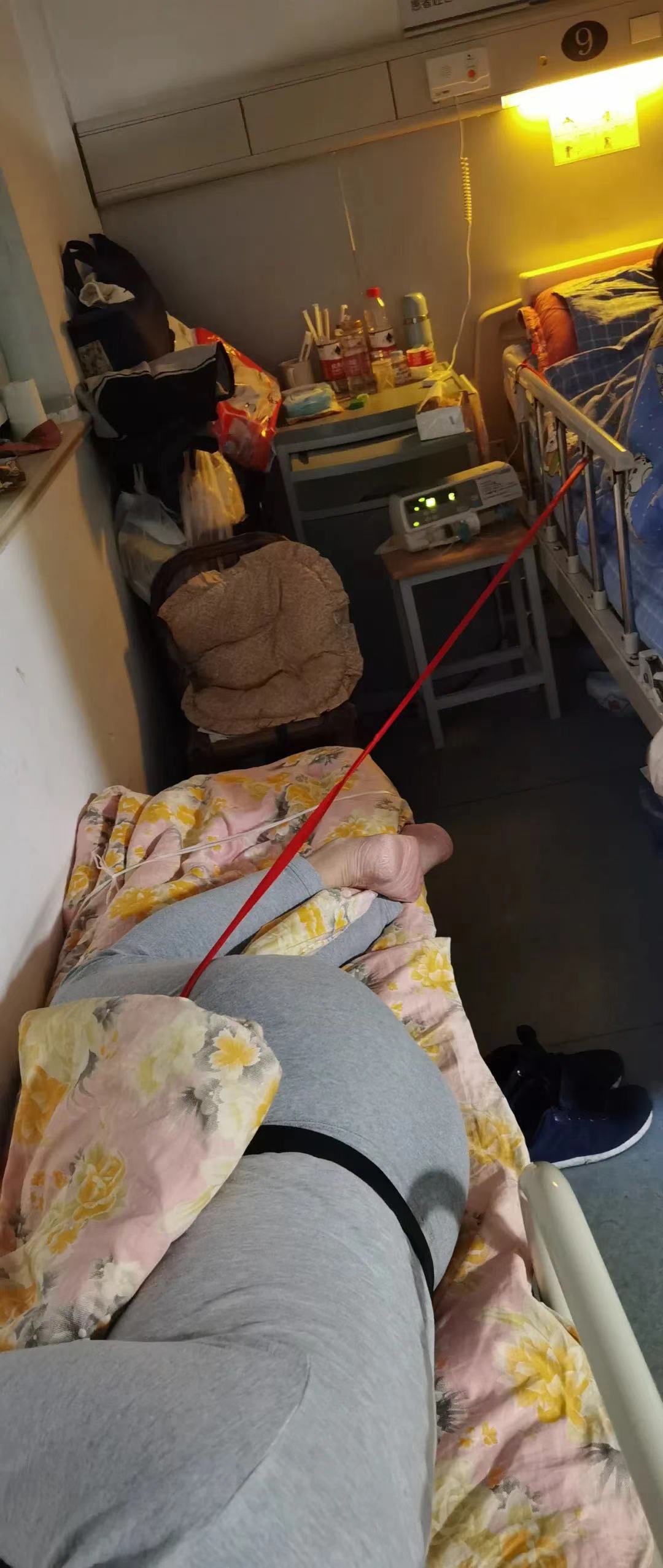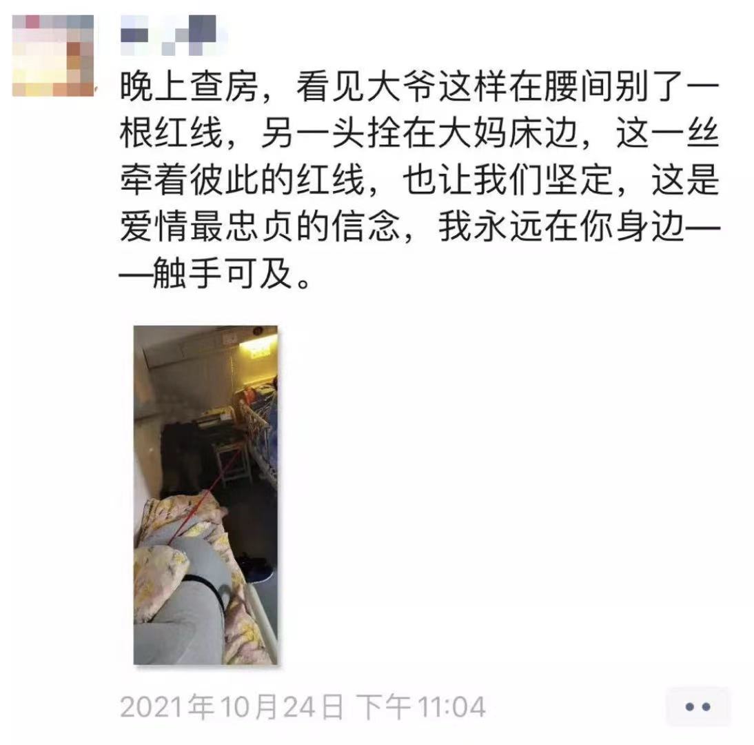 护士夏贵桃夜间查房时看到这一幕,忍不住发朋友圈感慨:“这一丝牵着彼此的红线,也让我们坚定,这是爱情最忠贞的信念,我永远在你身边——触手可及。”
