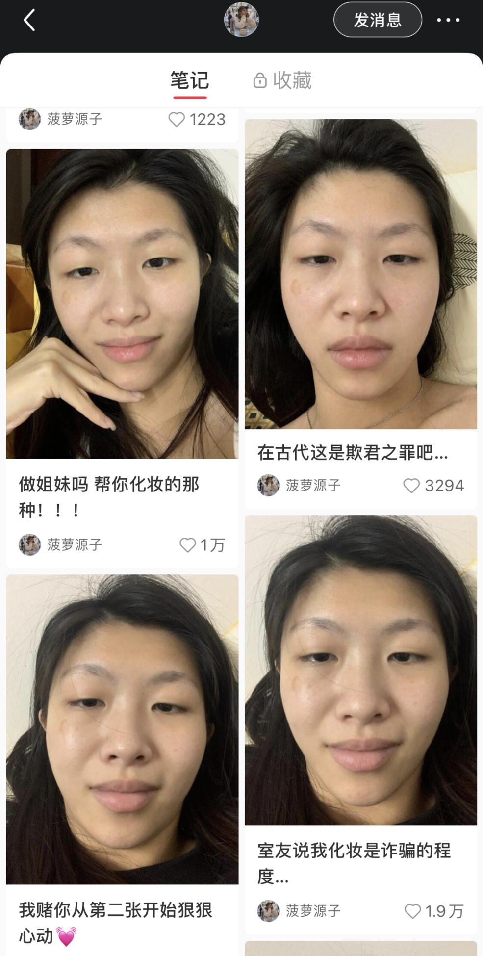现实生活中,菠萝是一名会计专业在读的普通大四学生,因为喜欢化妆选择成为一名兼职美妆博主。在她的小红书主页上,笔记封面齐刷刷都是她的素颜大头照,