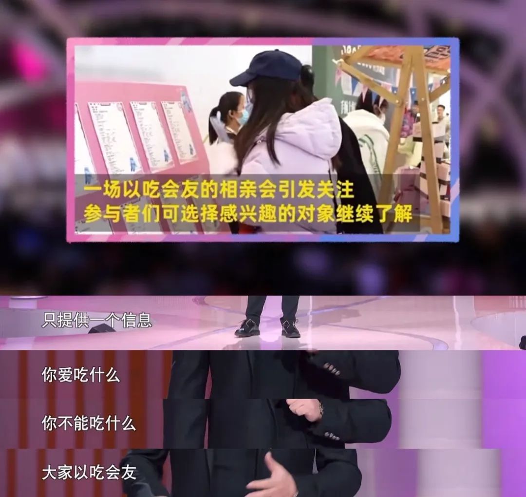 《非诚勿扰》节目中分享了一种“吃到一起”的相亲模式,即双方仅仅提供爱吃的食物和不能吃的食物信息,以吃会友,让“吃什么”成为第一道门槛。先保证能吃到一起,再进行接下来的沟通。在相亲现场的男生直率表示,“那个女生连香菜都不能吃那肯定不能处啊”。