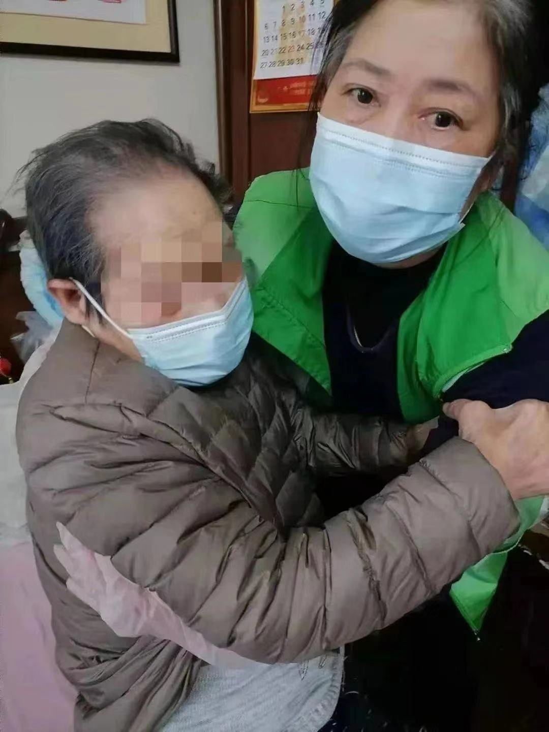 家住南京西路1955弄里的马奶奶已经88岁,子女久居外地。马奶奶因大病长期卧床,日常服务都由近90岁的老伴和护理员谭广美阿姨来维持。3月初,马奶奶的老伴不幸在家中摔倒骨折不能自理,家庭一下子陷入了困境,连日常生活也得不到保障。护理员谭广美化身老人的“子女”每日多次往返照料老人的起居和饮食,从早到晚要走好几次。4月1日全区封控,谭广美不放心2位老人,于是她放弃与家人同住,甚至没有时间为家里采购物品,主动和老人一起居家隔离,照顾老人日常起居饮食和护理工作。