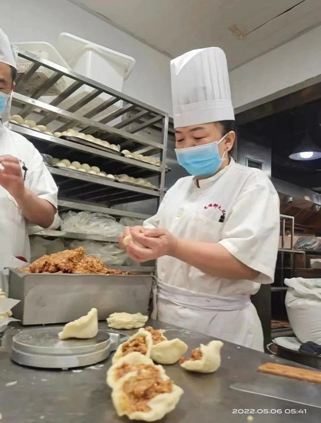 随着上海市防疫形势的好转,光明邨在5月1日推出两款点心套餐的社区团购,迈出复工复市的新步伐。留守已久的点心师张红燕做回老本行,洗菜、打包的双手再次捏起了面团,鲜肉月饼的香味也在店堂里重新飘起。