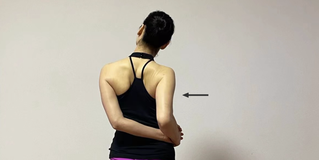 站立,双手置于臀后十指交叉握拳,吸气,胸部向前和向上,呼气伸直双臂同时双手向下拉,将肩胛骨下沉,反复练习数次。