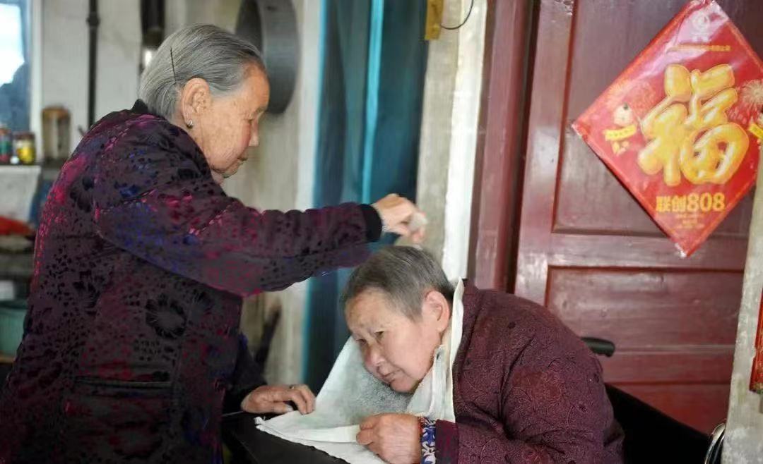 如今任彩梅已经70多岁了,但在孙银聪眼里,她就是个“老小孩”,而且年纪越大越喜欢撒娇,离了婆婆一会儿就开始哼哼唧唧,孙银聪也由着她耍赖。总有村里人打趣说:“一个弓着腰的太婆推着一个白头发的太婆,像一对老姐妹哩!”