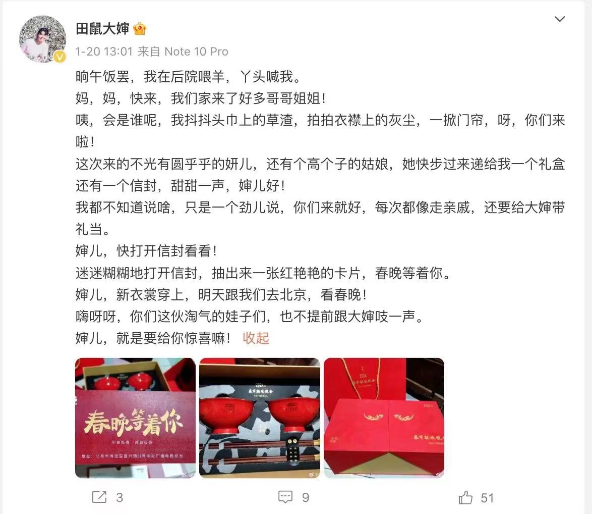 “田鼠大婶”和村民们一起热情款待了前去邀约的工作人员,还线上更新了自己的“日记”,记录下“田鼠大婶”和春晚的故事。