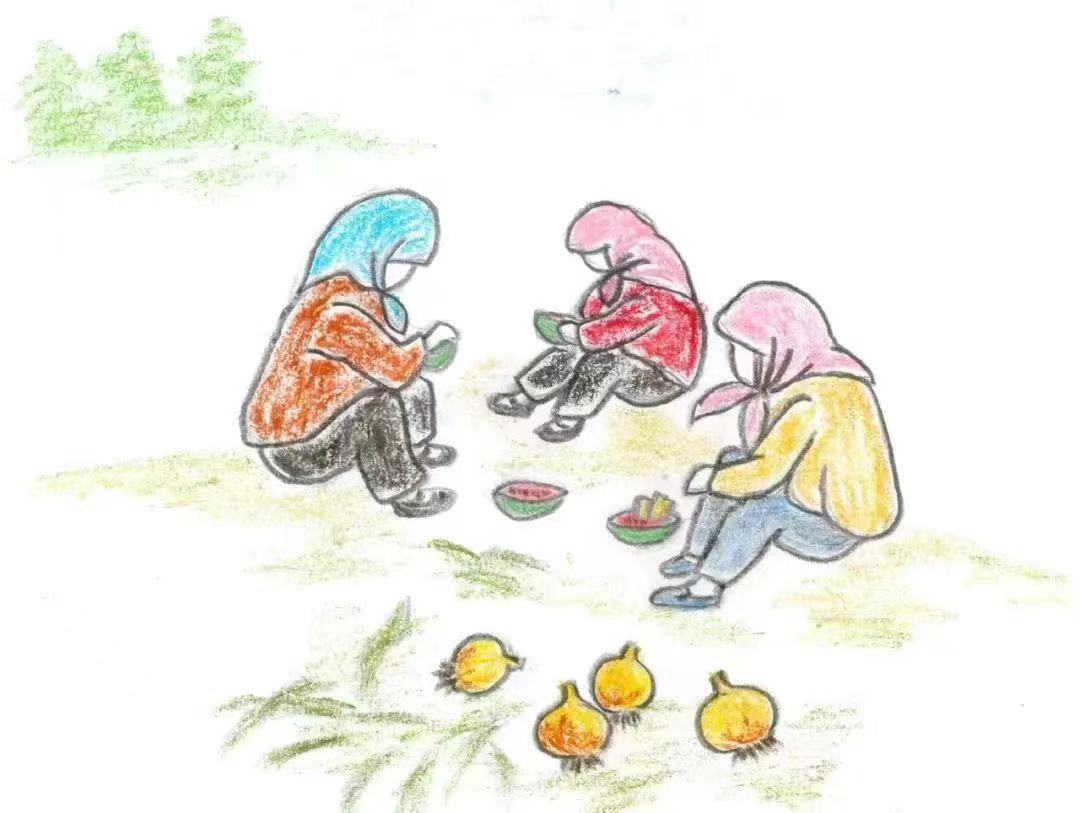 裴爱民还爱画画,她用熟悉的作物和劳作场景作画记录眼中的浪漫,她说梵高的画让她在低头劳作时也能仰望星空。