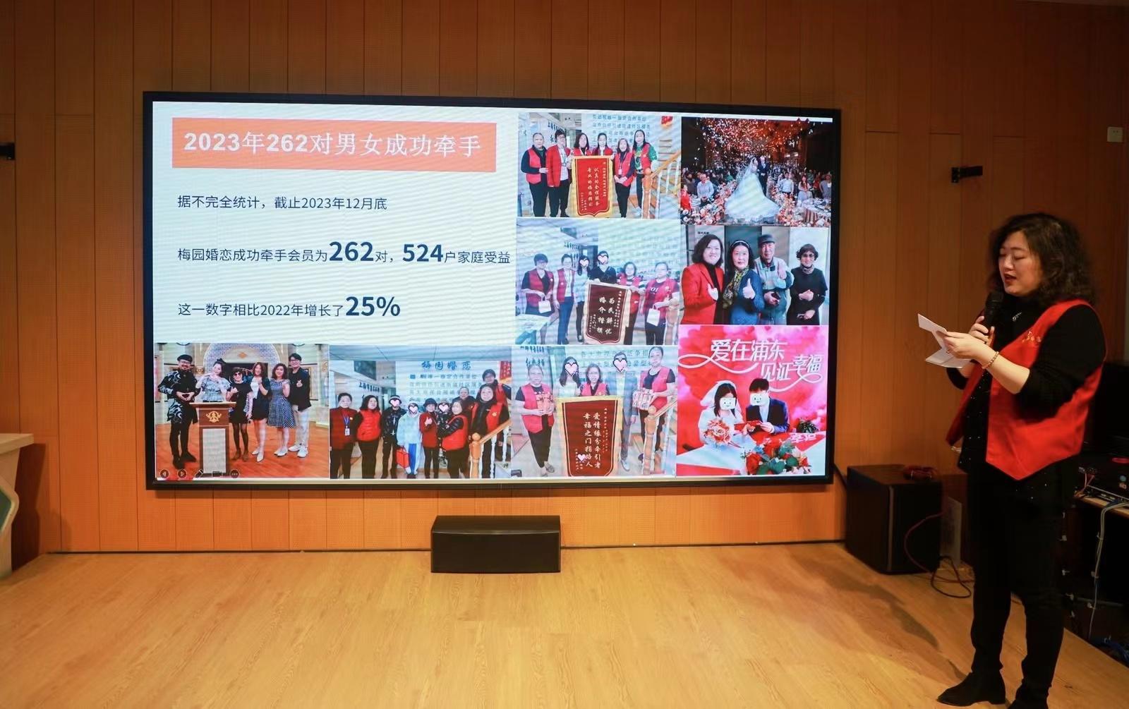 今天的活动却有点不同,第三代梅园宝宝——3岁女娃娃小林,为梅园创始人红梅老师献花,让台下头发花白的爷爷奶奶们“眼热”,纷纷向小林的奶奶打听儿子成功脱单的诀窍。原来,小林的爸爸听说同事在梅园相亲成功后,主动找到梅园婚恋注册了会员,第二次相亲就成功牵手了。这样的甜蜜故事,仅2023年,便在梅园发生了262起,梅园红娘全年帮助524位男女会员顺利“脱单”,比上一年增加了25%。