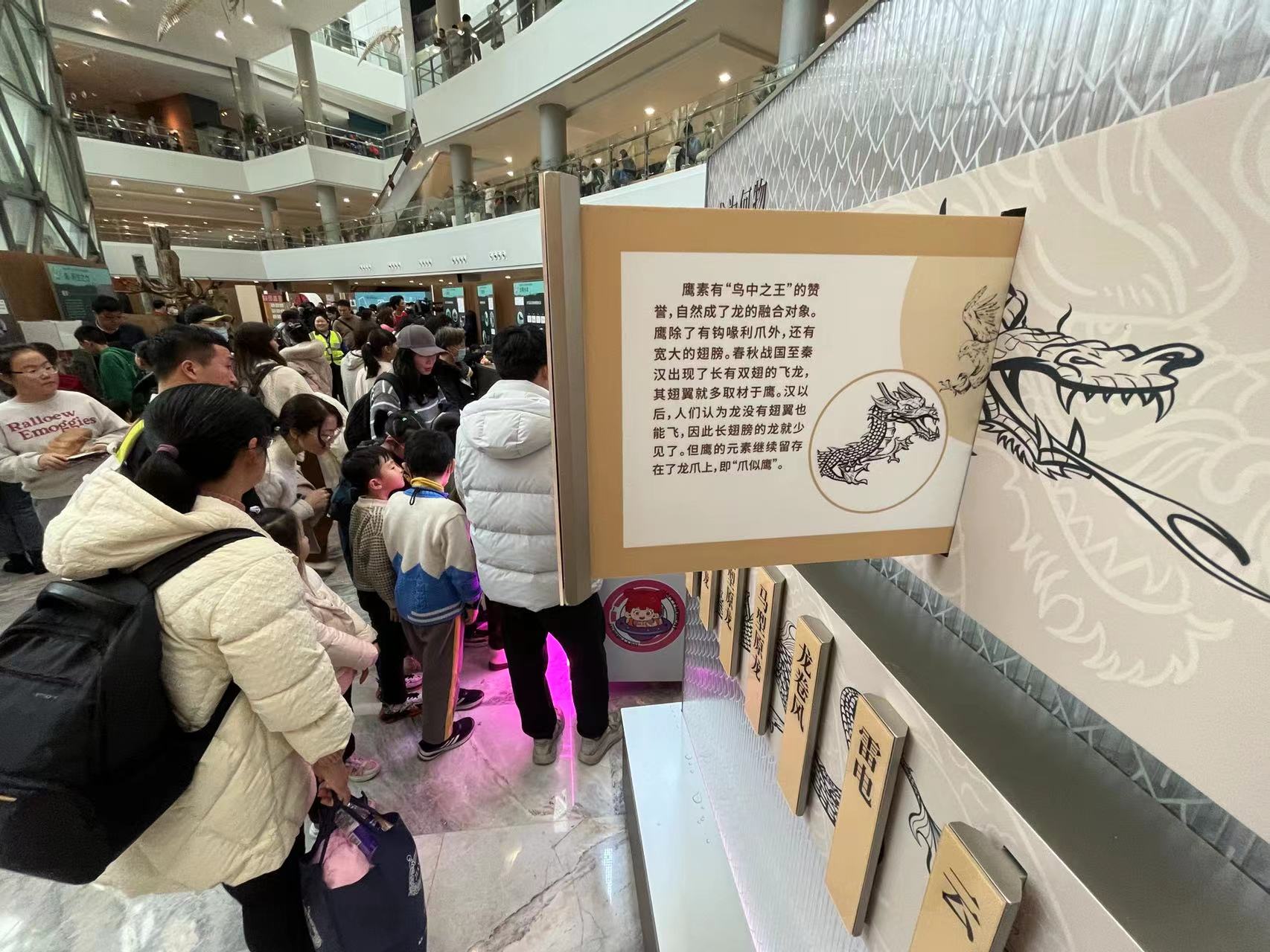 春节期间,上海自然博物馆迎来了客流小高峰,晴好天气更是吸引了众多游客前来参观。龙年新春,最受欢迎的当属由上海科技馆原创策划的“有龙则灵——2024甲辰龙年生肖特展”,吸引了一众大朋友、小朋友打卡互动。