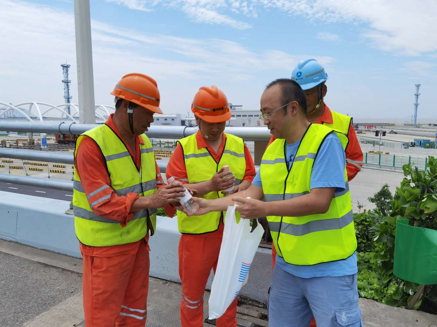记者为养护工人们送水