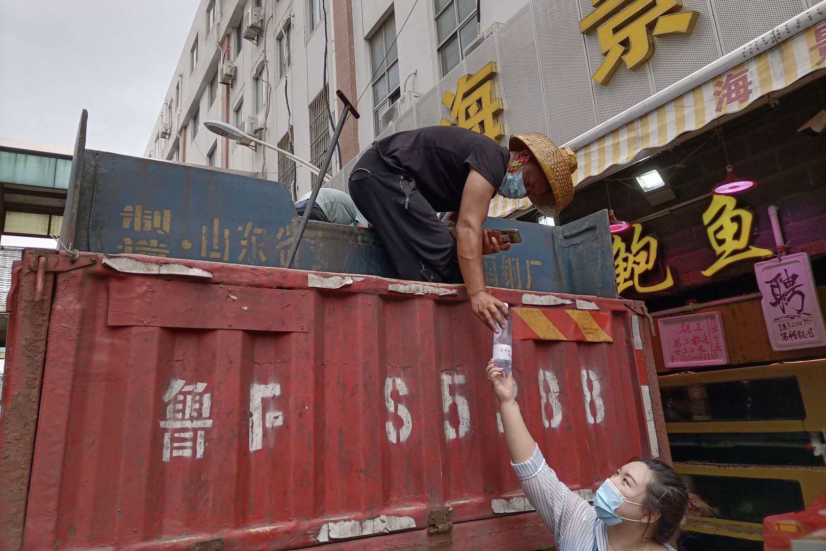 一边卸鱼,一边将车上的水通过管道排出,车辆慢慢清空。收到劳动报记者递来的这瓶水,郑春刚露出了一丝笑容。“长途路上不能上厕所,所以不敢喝水。到了就开始干活,也没时间喝口水。”