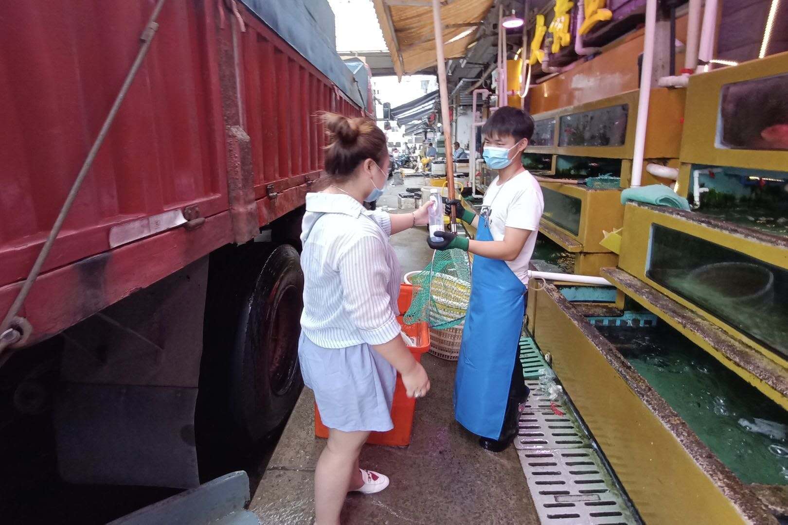 中午11时30分,张元富在海景水产的铺位前,用一个偌大的网兜接过郑春刚从车上递下来的一条又一条珍珠龙胆鱼。在正午时分的烈日下炙烤,年轻的张元富满脸都是汗水。接过记者递去的瓶装水,他说先放一放,现在没有时间喝口水。