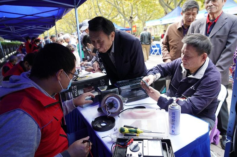 现场便民服务也吸引了众多老年人捧场,理发、修伞、修拉链、修鞋、修钟表、小家电维修、修洗眼镜、修电话机、织补、裁剪、量血压、白内障预检、眼科疾病咨询、听力测试、老年推拿保健、安全用药,每个摊位前都是人头攒动。一旁的红马甲志愿者们则贴心地准备了排队座椅,组织老人井然有序地等候服务。