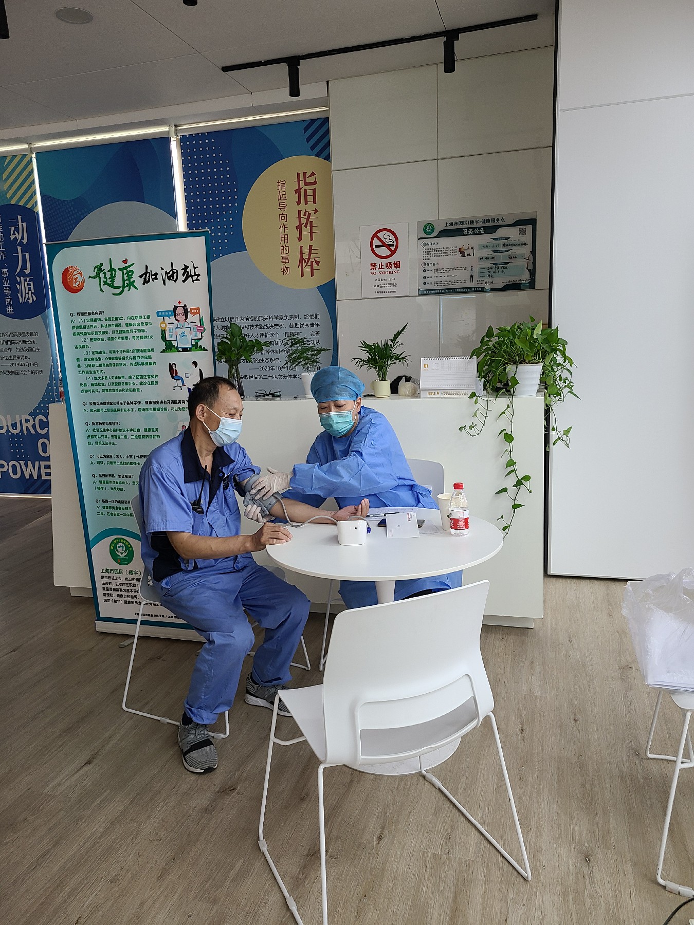 (园区后勤人员利用午休在健康服务点进行健康检查)