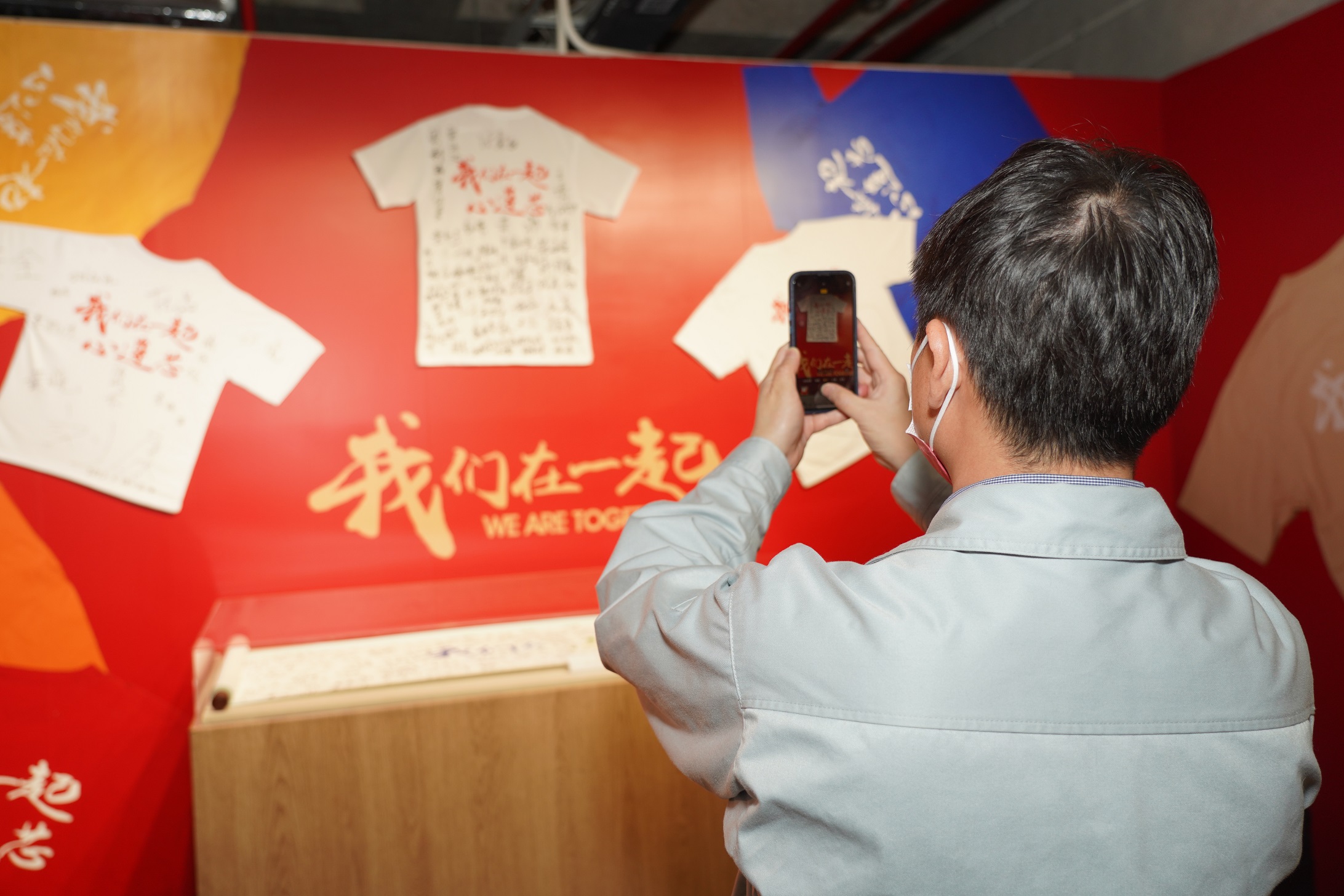 (首批参观者共同签名的T恤组成本次展览中收入的最后一件展品,职工在展品前拍照留念。)